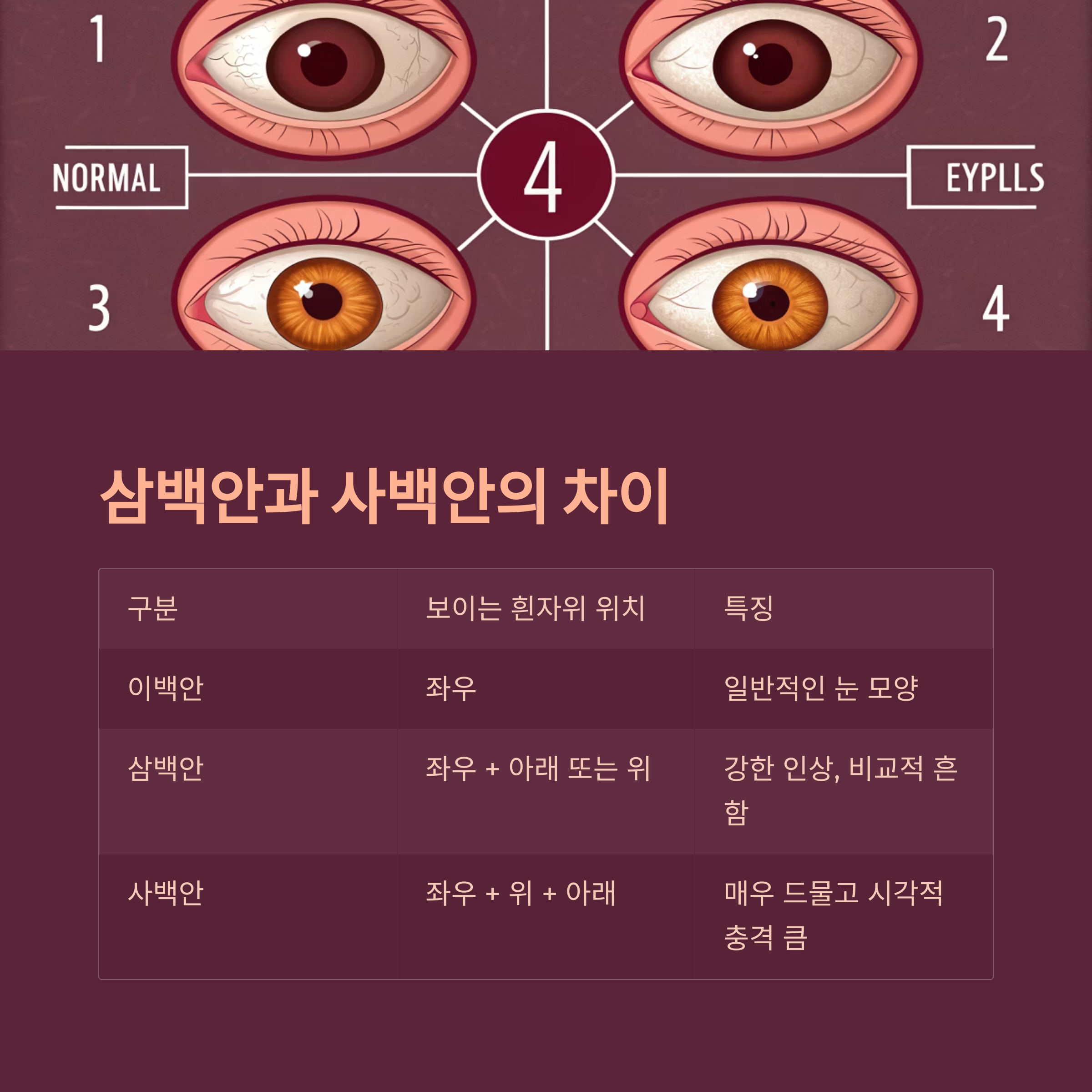 | 사백안 | 위 + 아래 + 좌우 모든 방향에서 흰자위가 보임 |