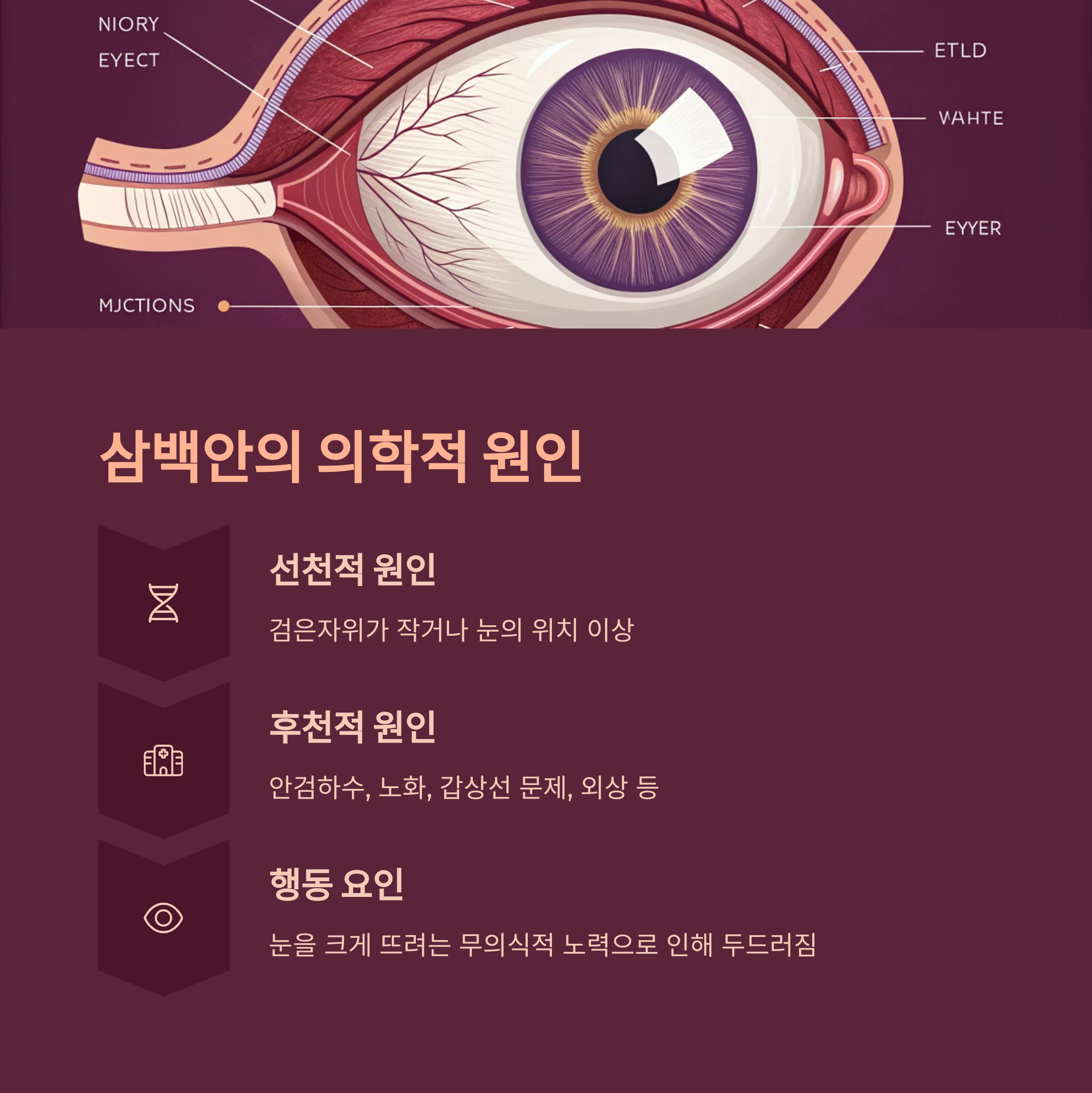| 후천적 원인 | 안검하수, 노화, 갑상선 문제, 외상 등 |