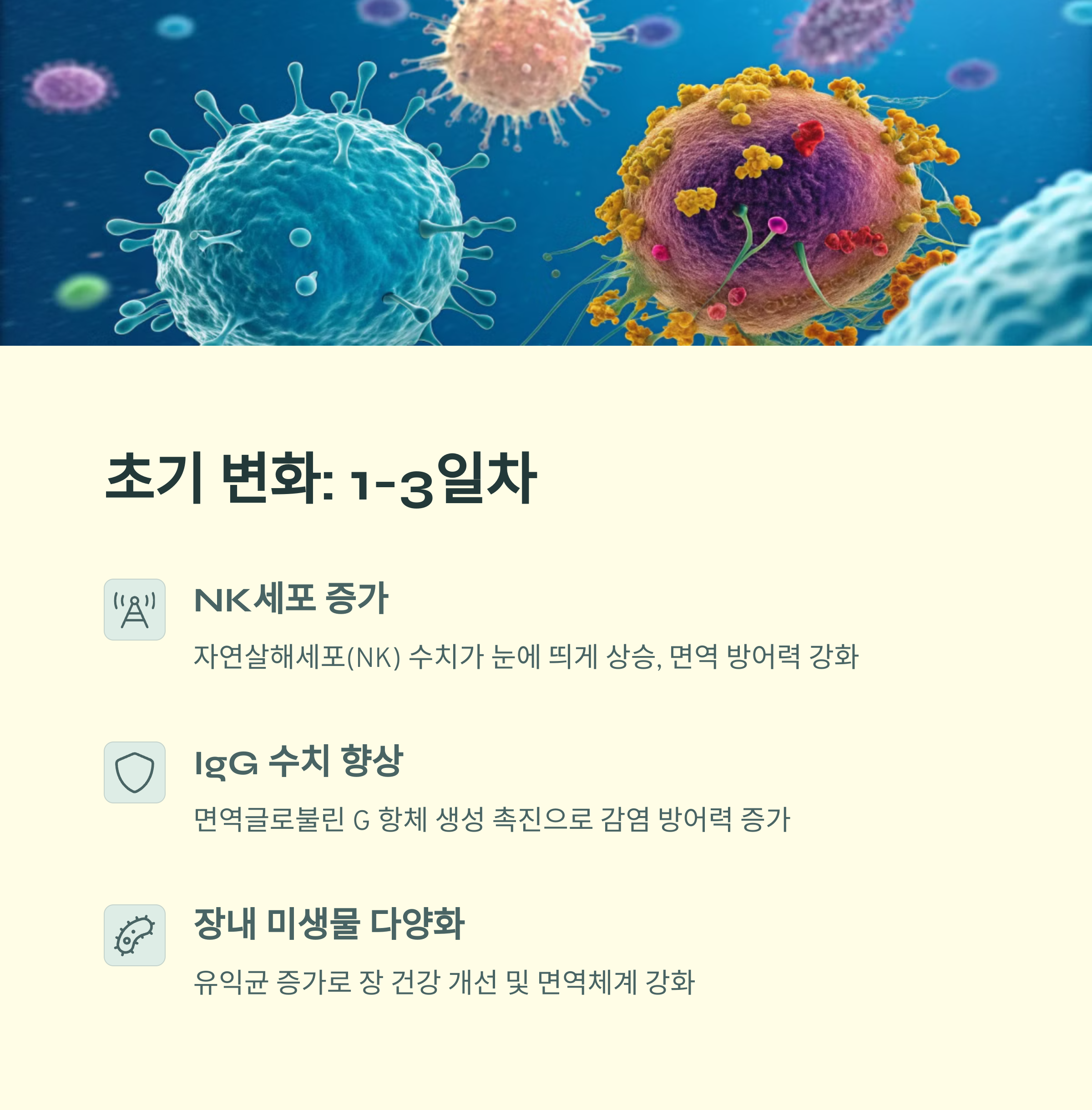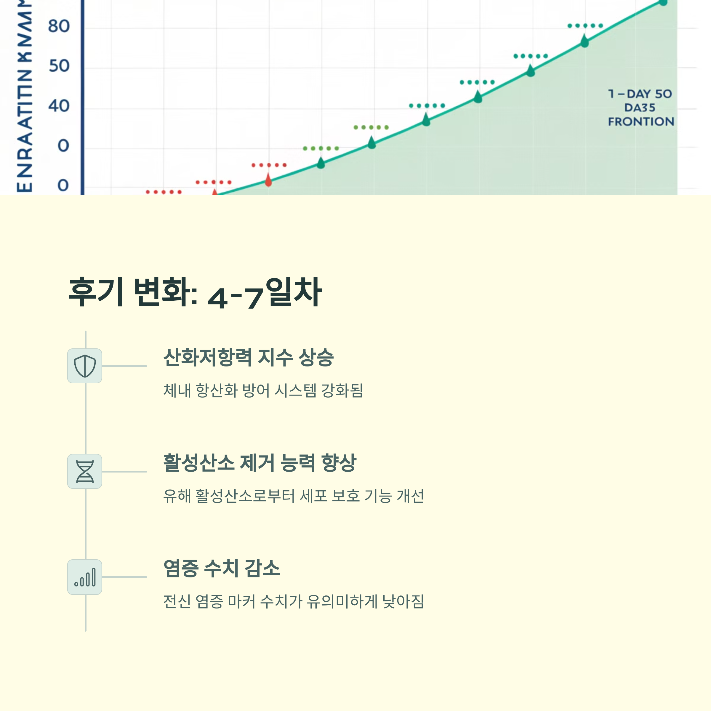7일간의 실험 결과를 보면 1일차에는 6-진저롤 농도가 혈중 42.0nmol/L까지 상승하며, 대식세포의 흡수력이 18%까지 향상되었습니다. 3일차에는 IL-6가 22% 감소하며 염증성 사이토카인 반응이 진정되고, NK세포는 15% 활성화되었습니다. 이후 5일차에는 장내 비피더스균이 1.5배 증가, IgG 수치가 12% 향상되었습니다. 마지막 7일차에는 호중구의 산화 스트레스 저항력이 27% 향상되었고, 림프구 능력도 19%나 증가했습니다. 매우 의미 있는 면역 반응의 흐름입니다.