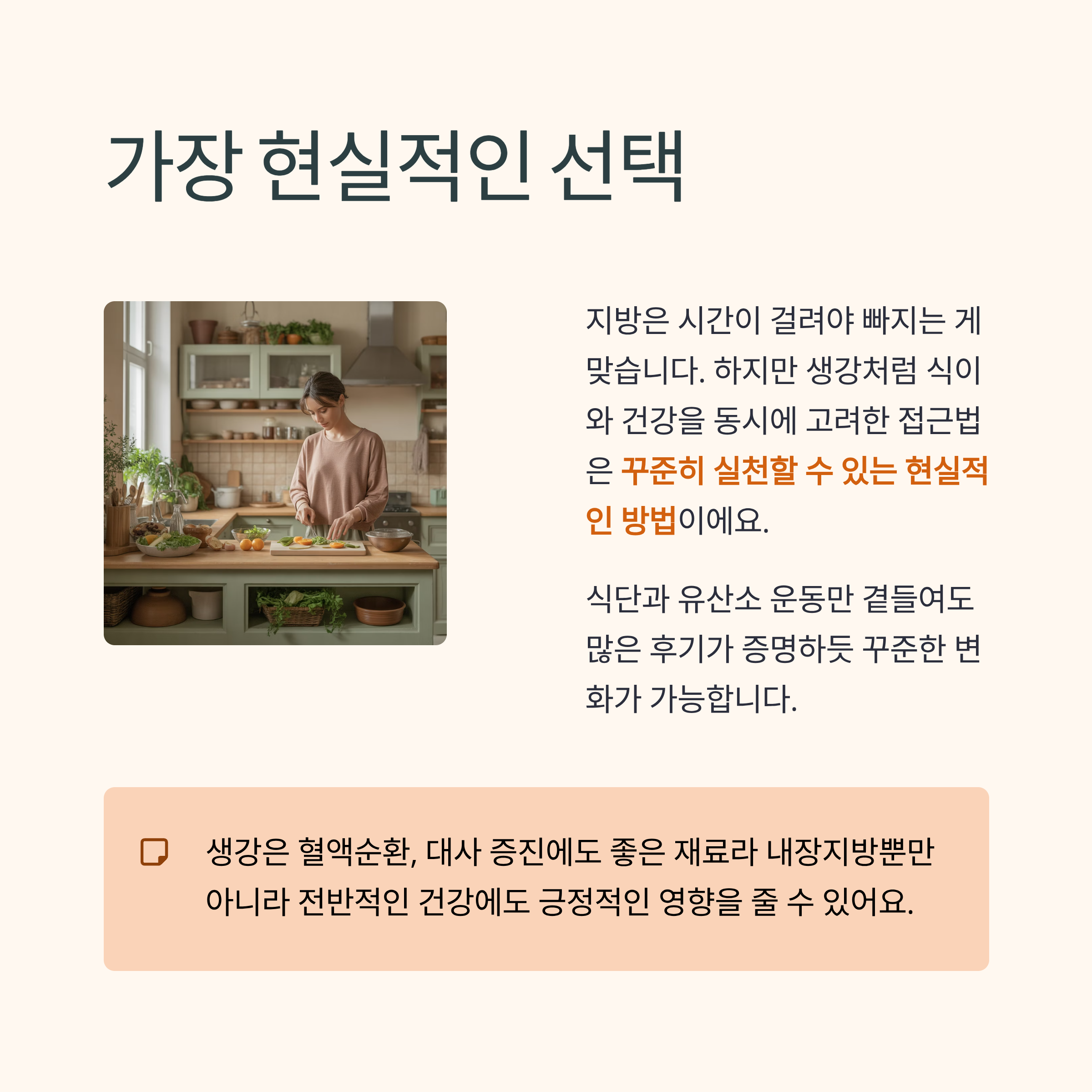 하지만 생강처럼 식이와 건강을 동시에 고려한 접근법은 꾸준히 실천할 수 있는 현실적인 방법이에요.