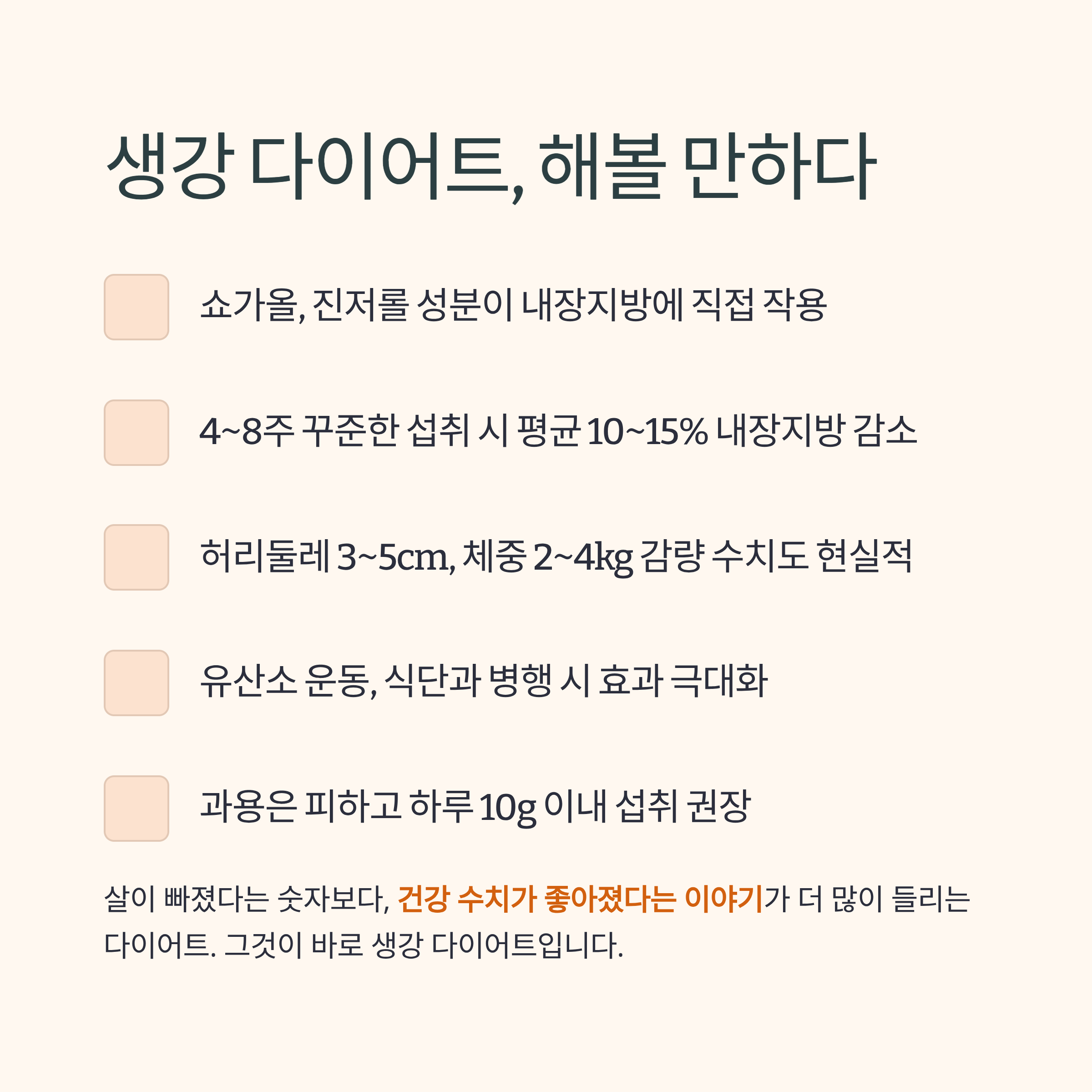 • 허리둘레 3~5cm, 체중 2~4kg 감량 수치도 현실적