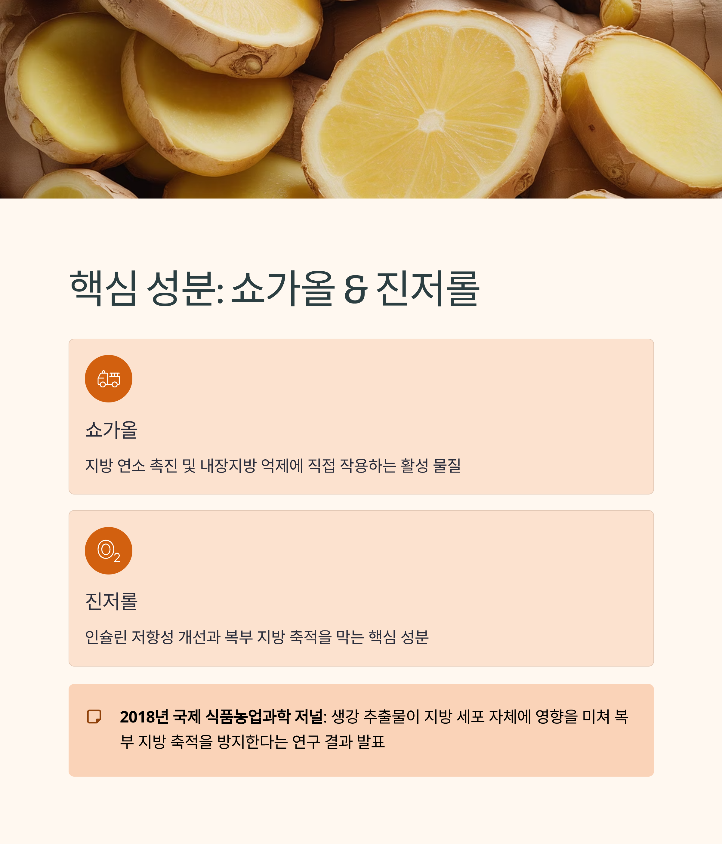 이 둘은 단순한 자극제가 아니라 지방 연소 촉진과 내장지방 억제에 작용하는 활성 물질로 알려져 있어요. 실제 2018년 국제 식품농업과학 저널에 실린 논문에서도 생강 추출물이 인슐린 저항성을 개선하고 복부 지방 축적을 막는 데 효과가 있다는 결과가 나왔죠.