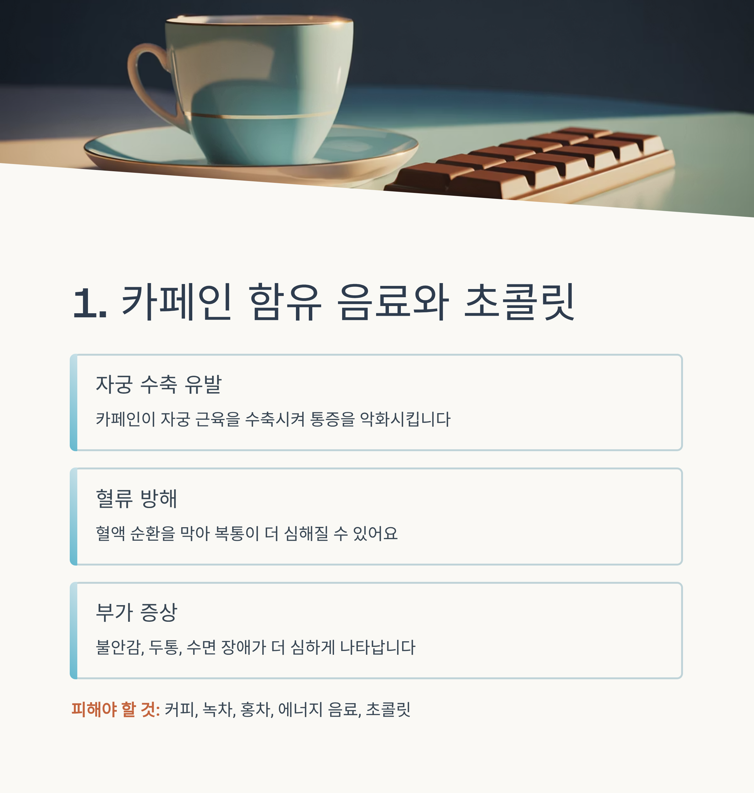 카페인은 자궁 근육을 수축시켜 통증을 유발하고, 혈류를 방해해 복통을 더 심하게 만들 수 있습니다.