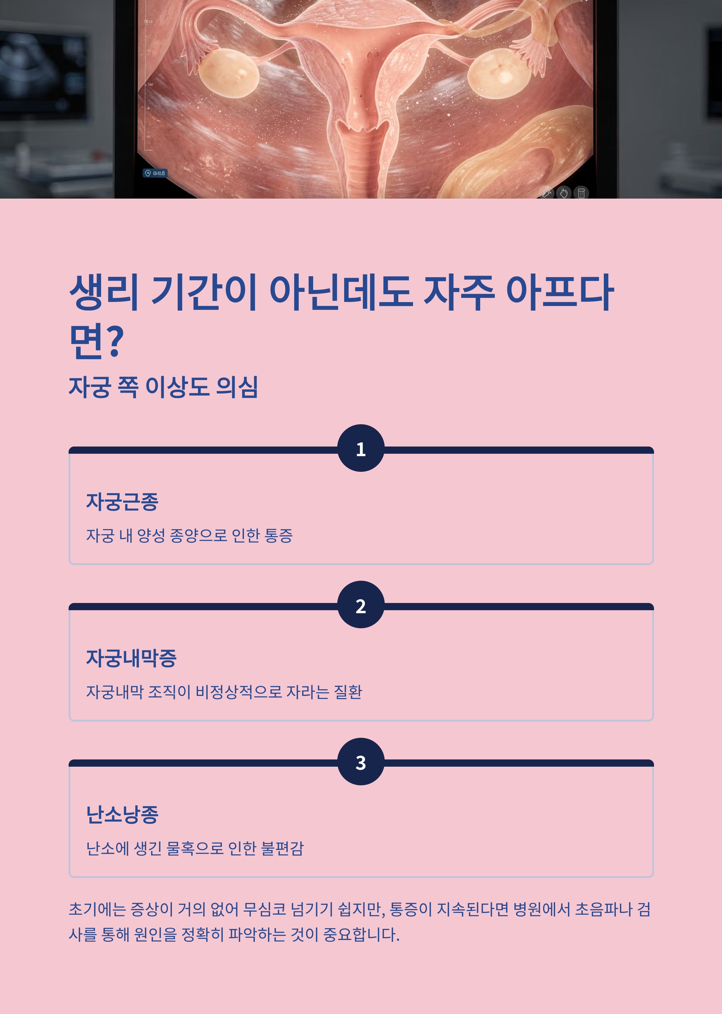 소화계 문제, 요로 감염, 난소 관련 문제 등은 초기에 발견하지 않으면 더 큰 통증으로 이어질 수 있어요.