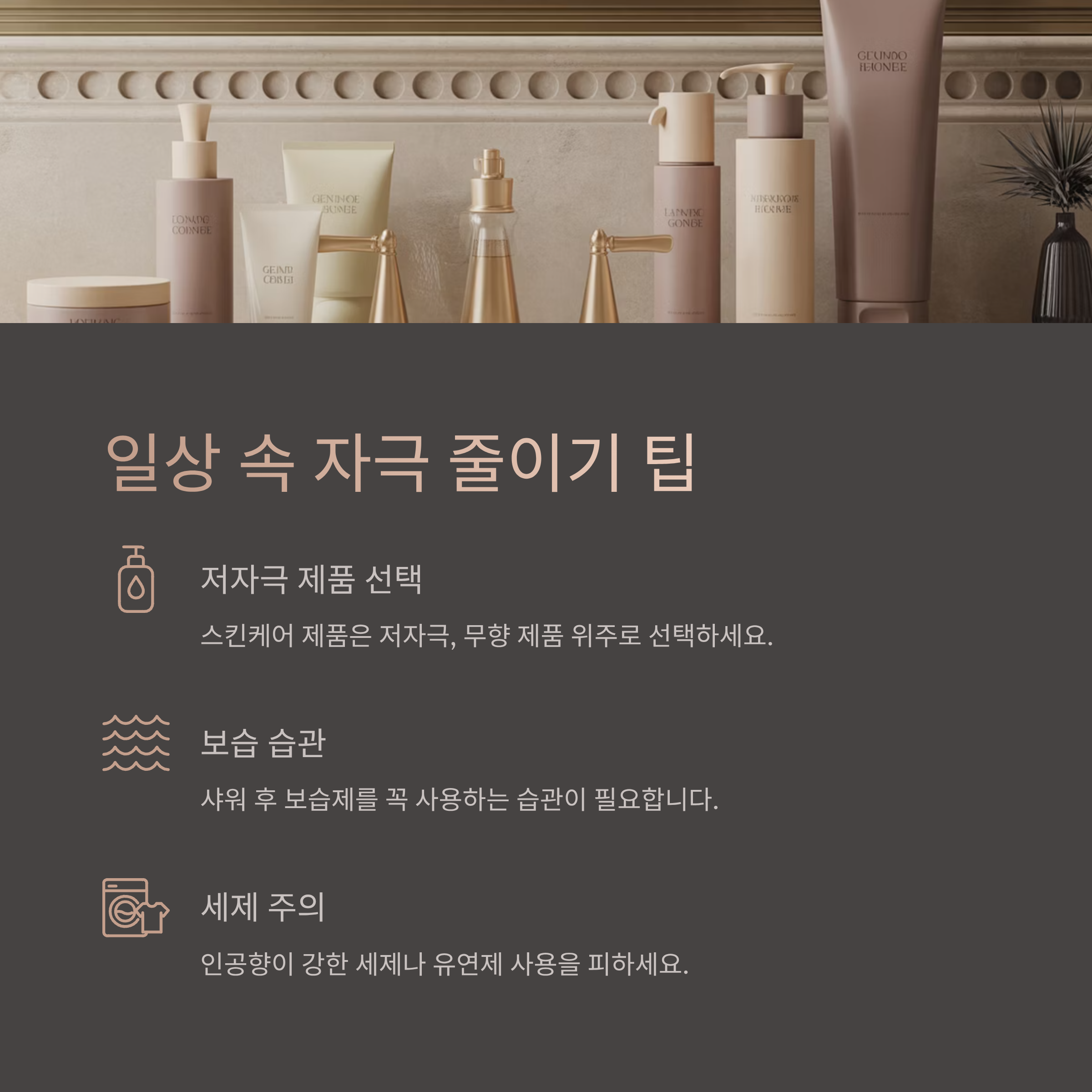 스킨케어 제품은 저자극, 무향 제품 위주로 선택하고, 샤워 후 보습제를 꼭 사용하는 습관이 필요합니다.
