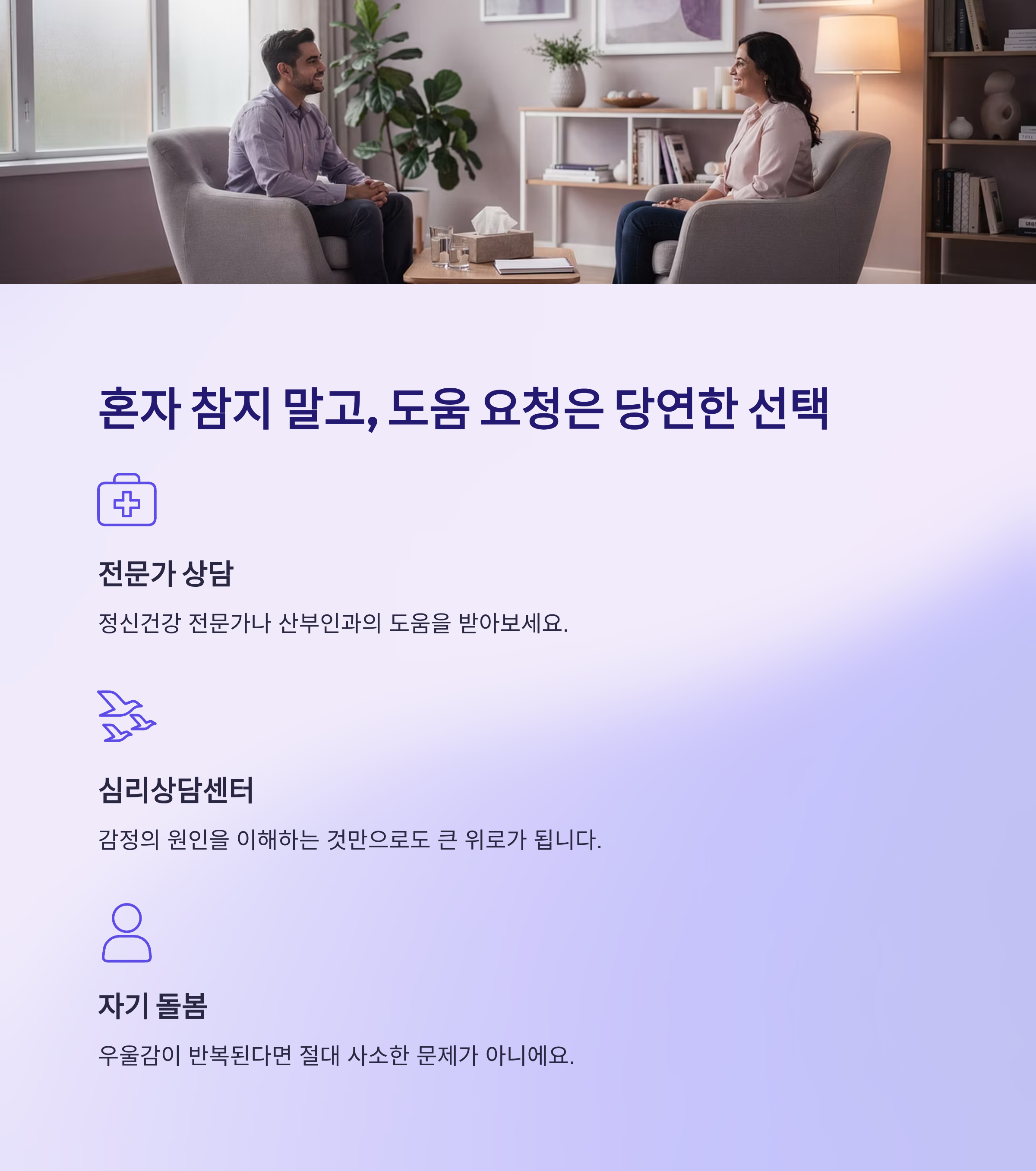 정신건강 전문가나 산부인과, 또는 심리상담센터의 도움을 받아보는 건 선택이 아니라 필요일 수 있어요.