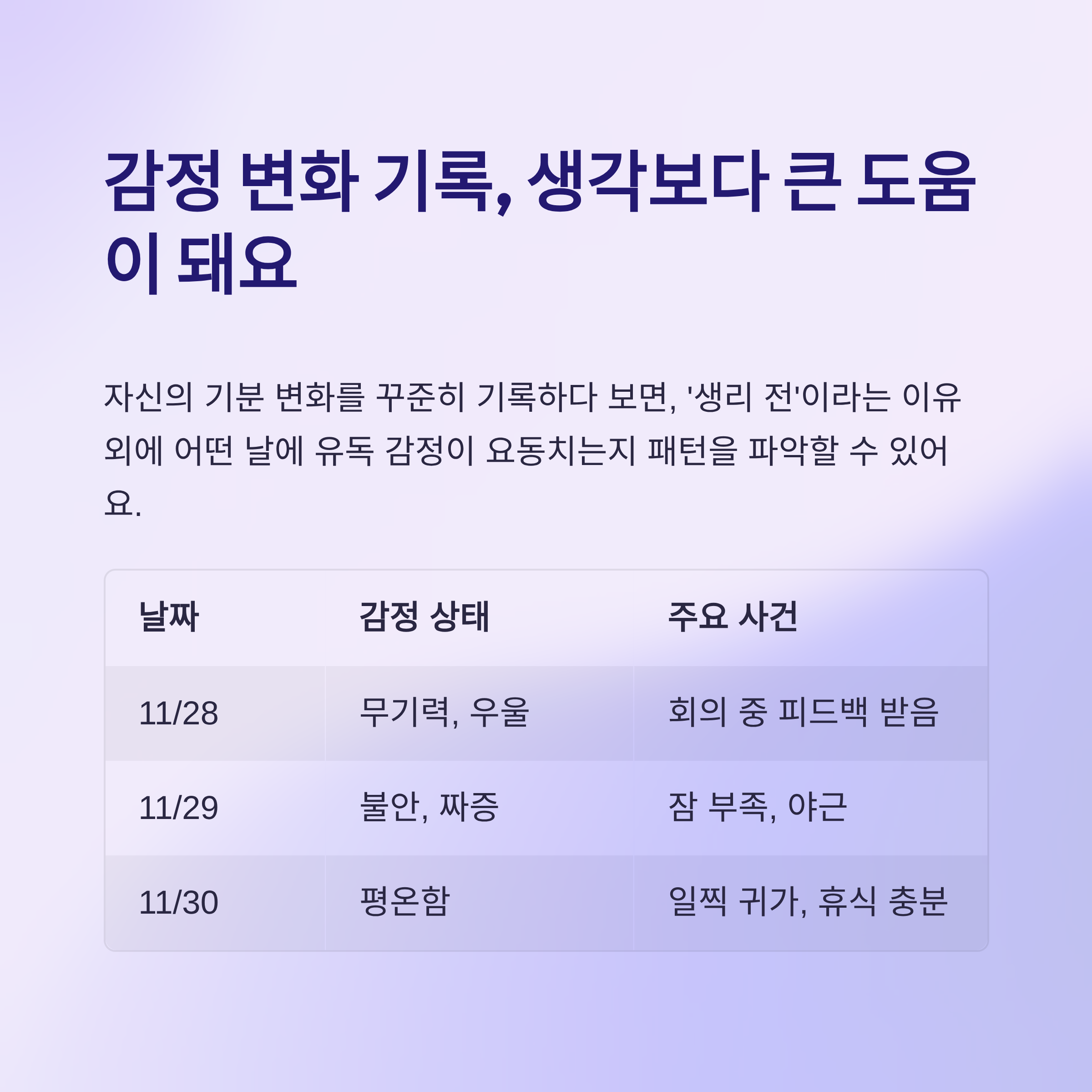 '생리 전'이라는 이유 외에 어떤 날에 유독 감정이 요동치는지 패턴을 파악할 수 있어요.