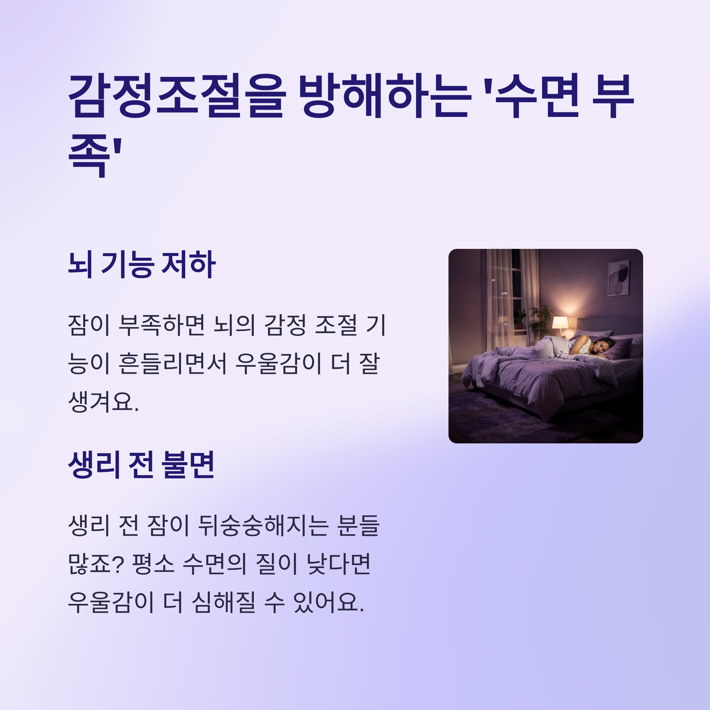 하지만 평소 수면의 질이 낮거나 불면증을 겪는다면, 생리 주기와 상관없이 우울감이 심해질 수 있어요.