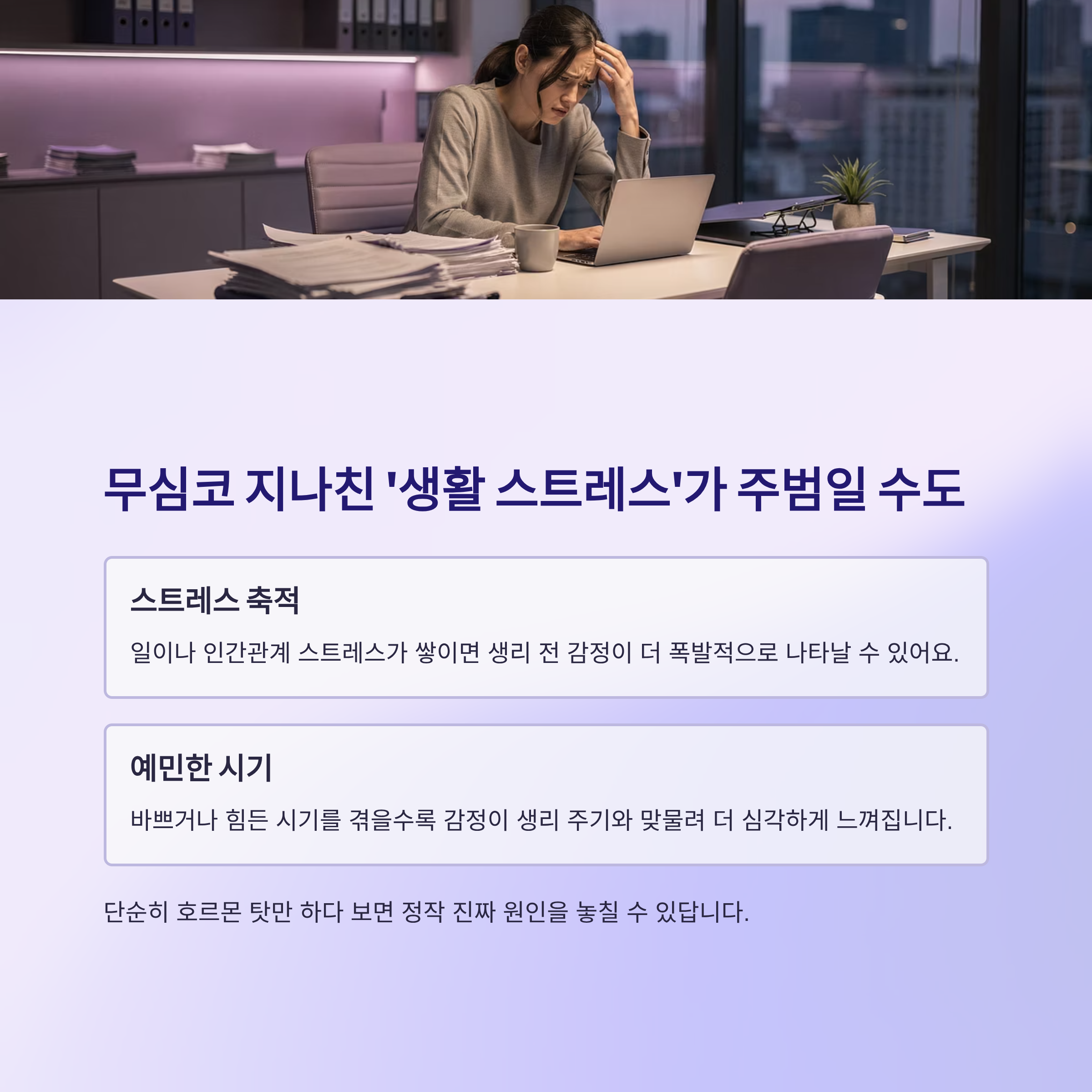 일이나 인간관계에서 받는 스트레스가 쌓이면, 생리 전 감정이 더 폭발적으로 튀어나올 수 있어요.