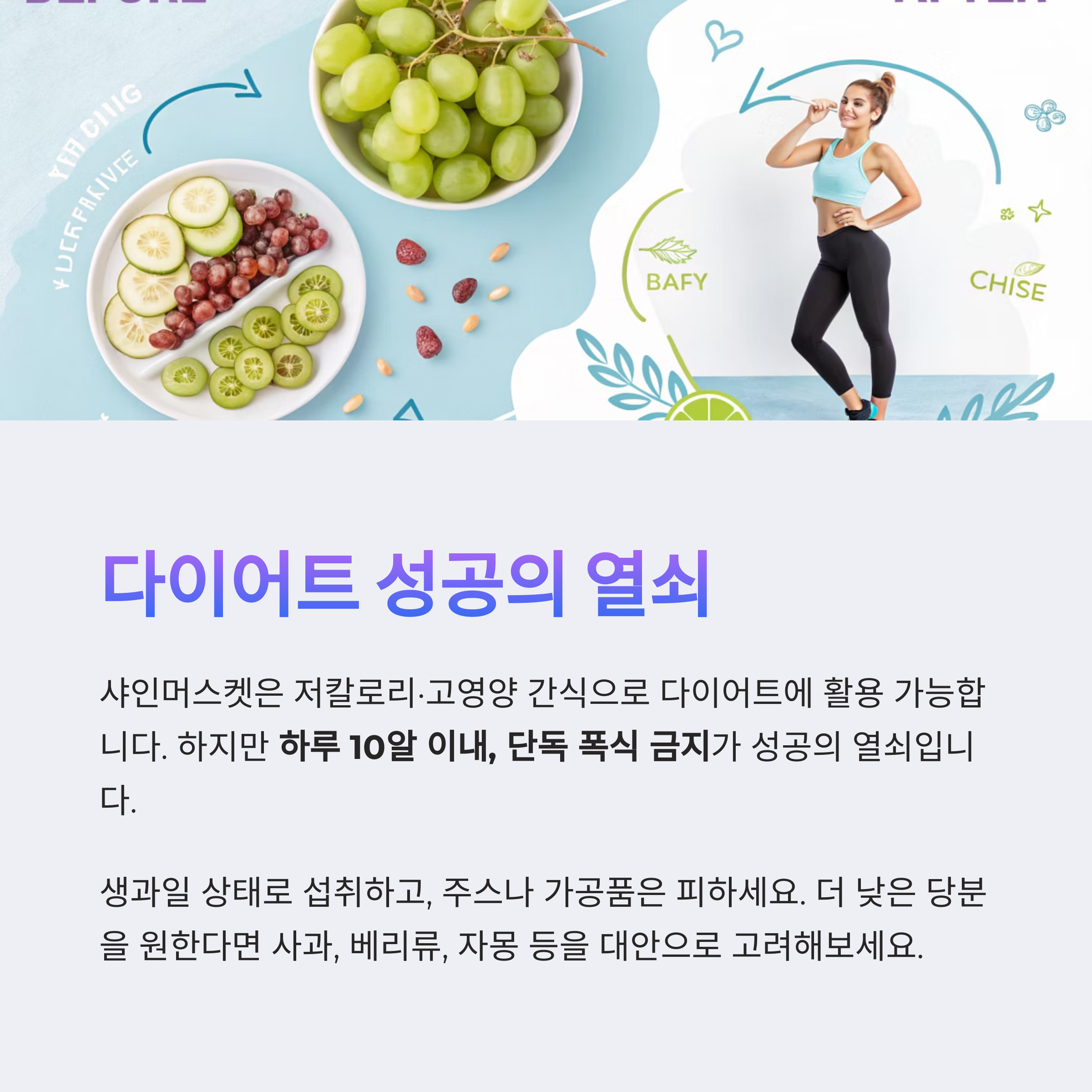 핵심 결론: 샤인머스켓은 다이어트 간식으로 활용 가능하지만 "하루 10알 이내, 단독 폭식 금지"가 성공의 열쇠입니다.
