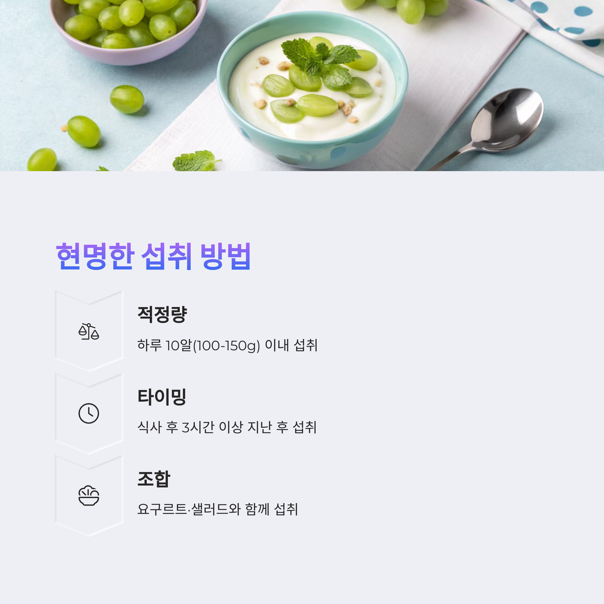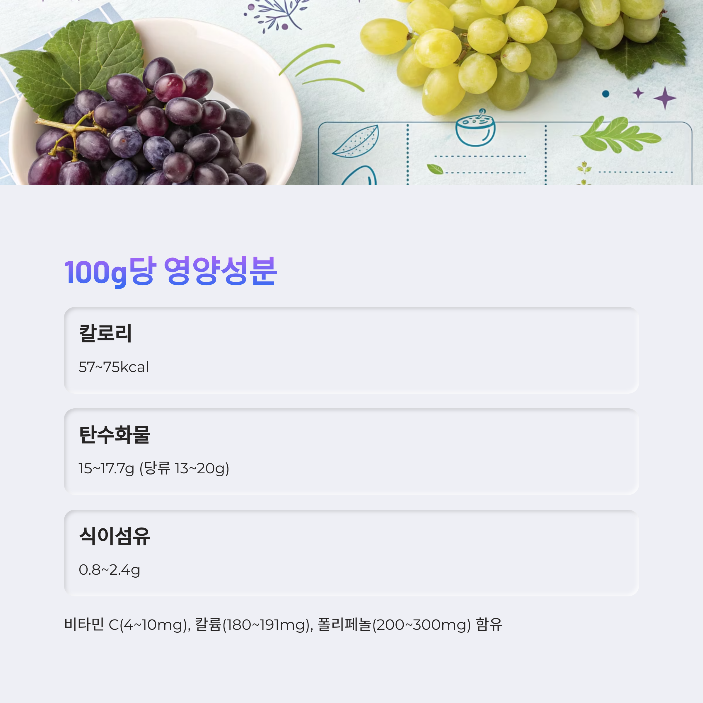 | 칼로리 | 57kcal 에서 75kcal | 일반 포도와 비슷하거나 낮은 수준 |