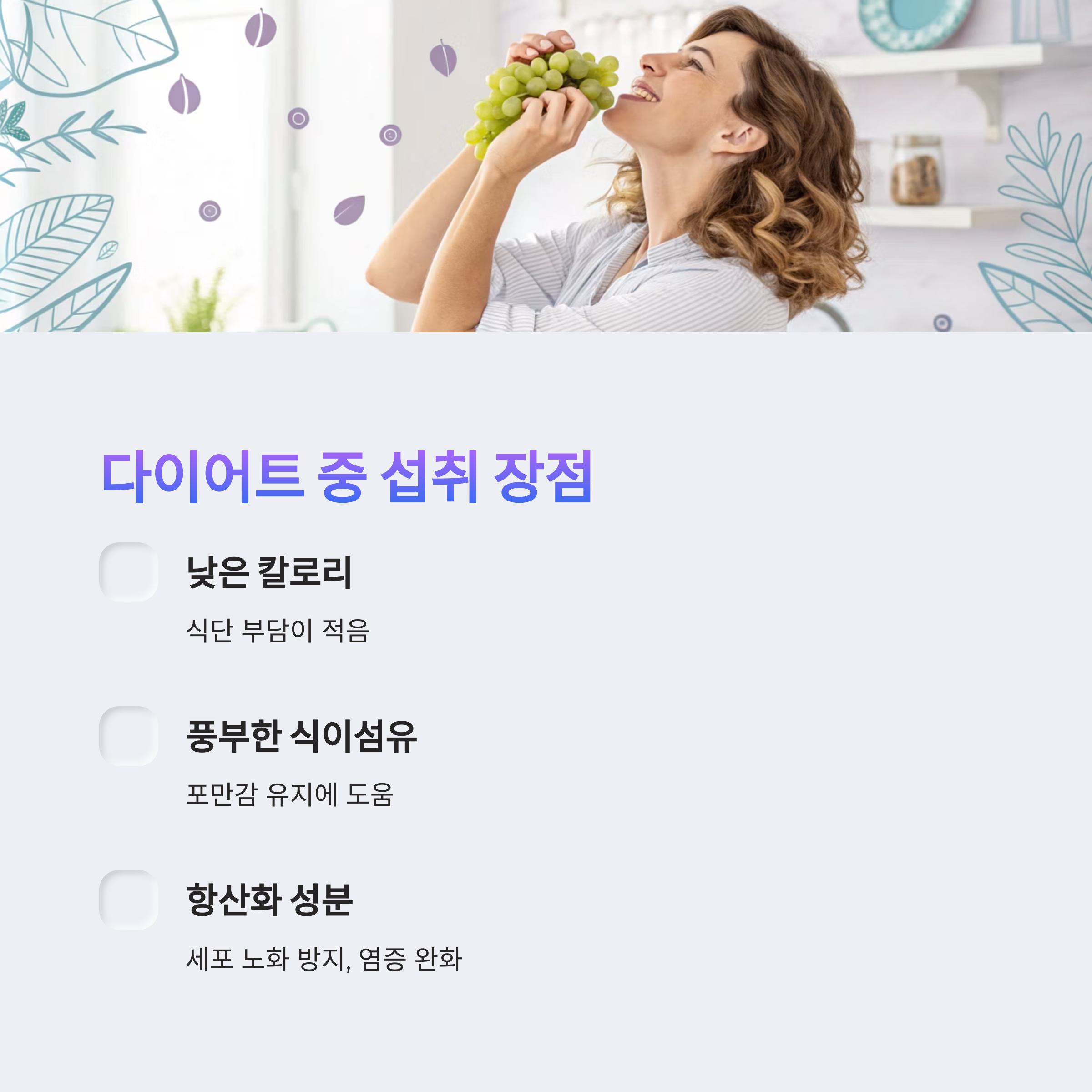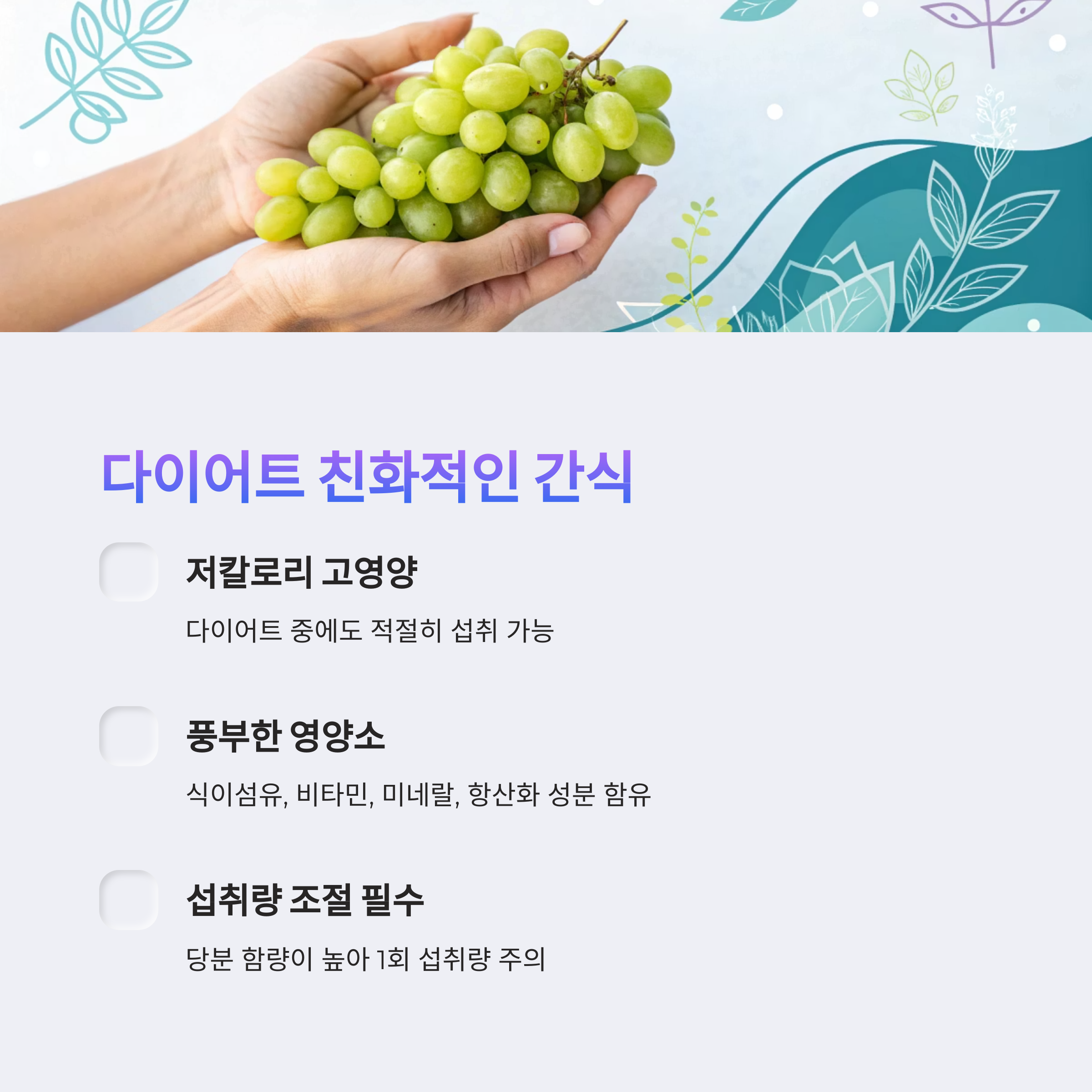 샤인머스켓은 저칼로리 고영양 간식으로 다이어트 중에도 적절히 섭취할 수 있습니다.