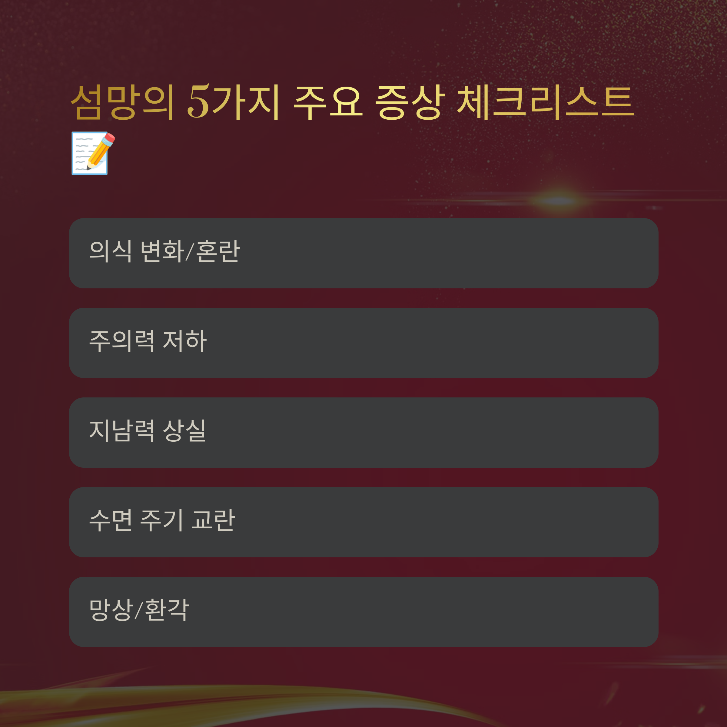 만약 가족 중에서 갑작스러운 인지 변화가 보인다면, 단순한 피로나 스트레스가 아니라 섬망의 초기 신호일 수 있습니다. 이럴 때는 방치하지 말고 빠르게 병원을 방문하여 전문가의 진단을 받는 것이 중요합니다.