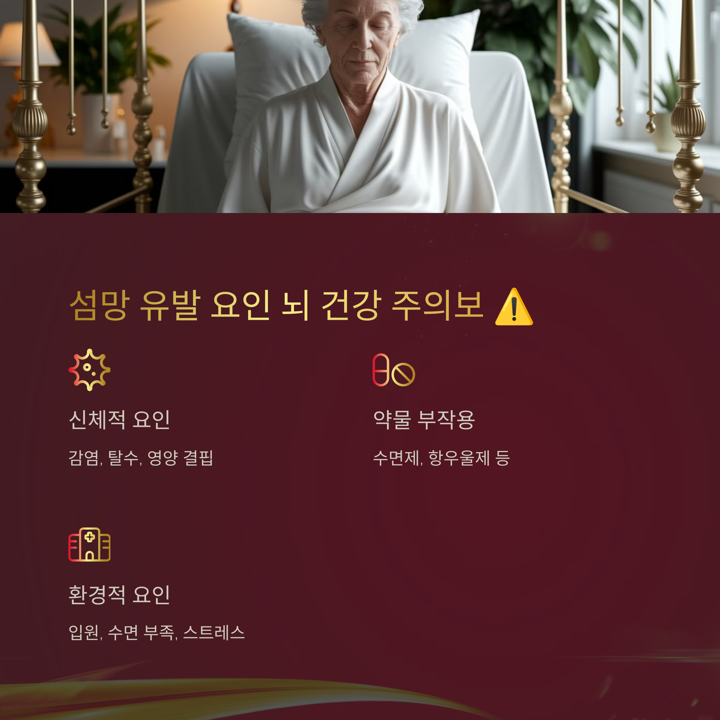 | 감염, 탈수, 약물 부작용, 환경 변화 | 기억력 저하, 착란, 환각, 불안감 | 규칙적인 생활, 충분한 수면, 친숙한 환경 조성 |