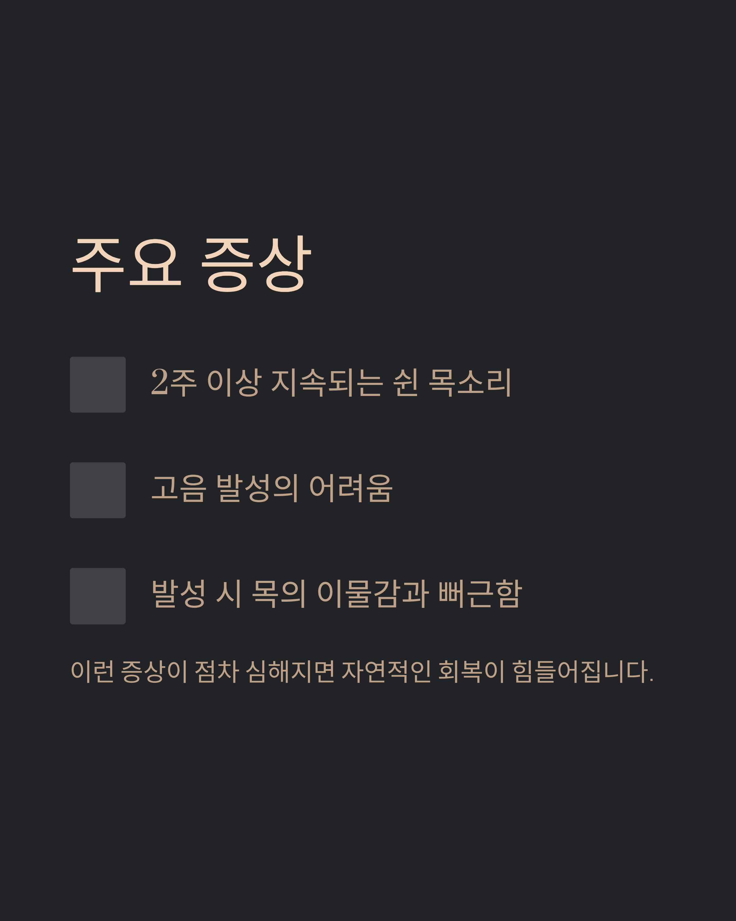 무심코 넘기기 쉬운 쉰 목소리도 2주 이상 지속된다면 전문 진료를 받아야 합니다. 조기에 관리하면 수술까지 가지 않고도 회복이 가능하니, 작은 신호를 놓치지 않는 것이 중요합니다.
