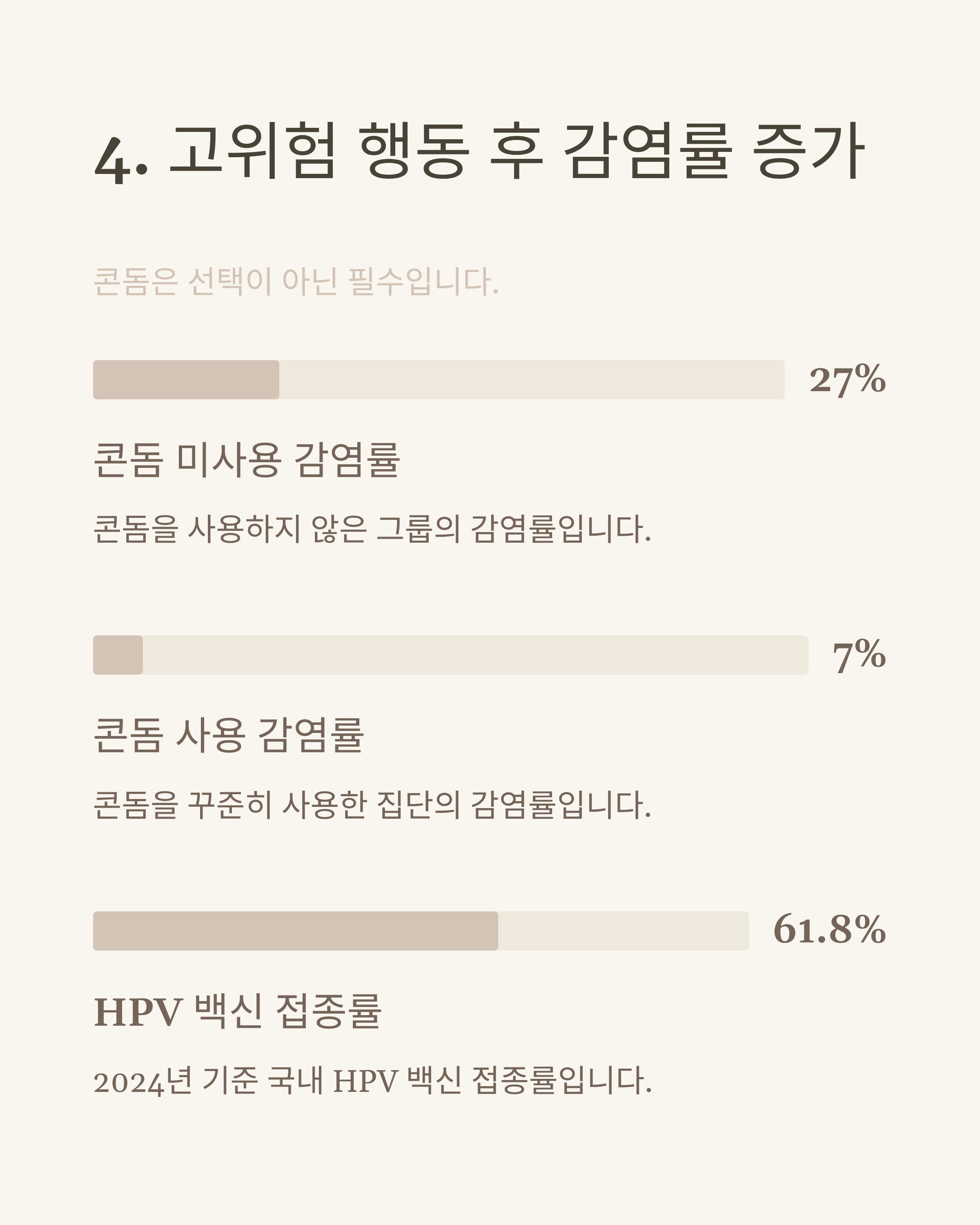 국내 연구에 따르면, 콘돔을 꾸준히 사용한 집단의 감염률은 7%였던 반면, 사용하지 않은 그룹은 27%에 달했습니다. 또한, HPV 백신 접종률은 61.8%(2024)에 머무르고 있어 여전히 감염 위험은 존재합니다.