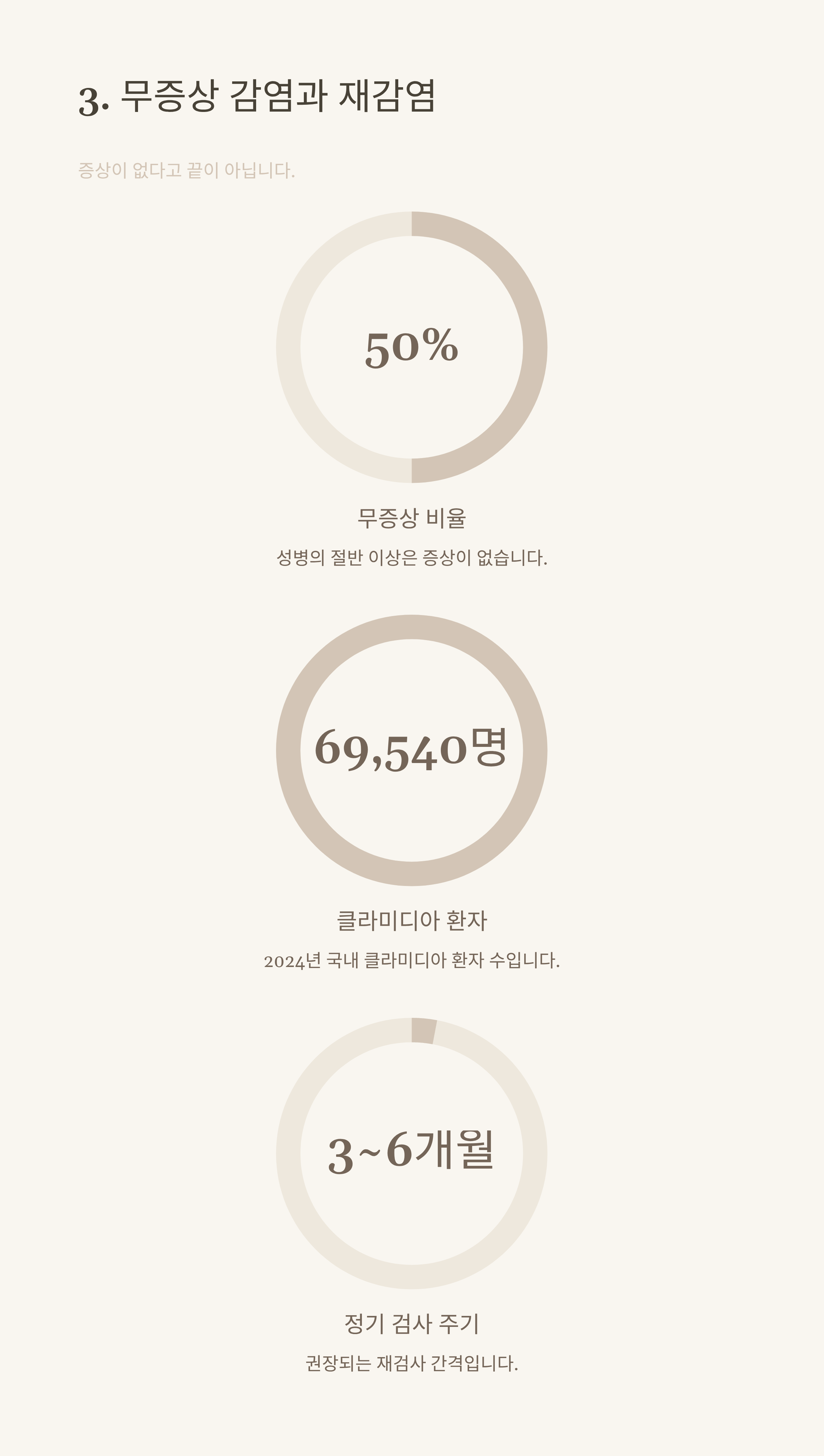 2024년 국내 보건복지부 자료에 따르면, 클라미디아 환자 수만 6만 9,540명에 달하며, 재감염 비율도 높습니다. 따라서 검사가 한 번 음성이 나왔다고 하더라도, 3개월~6개월 주기의 정기 검사가 필요합니다.