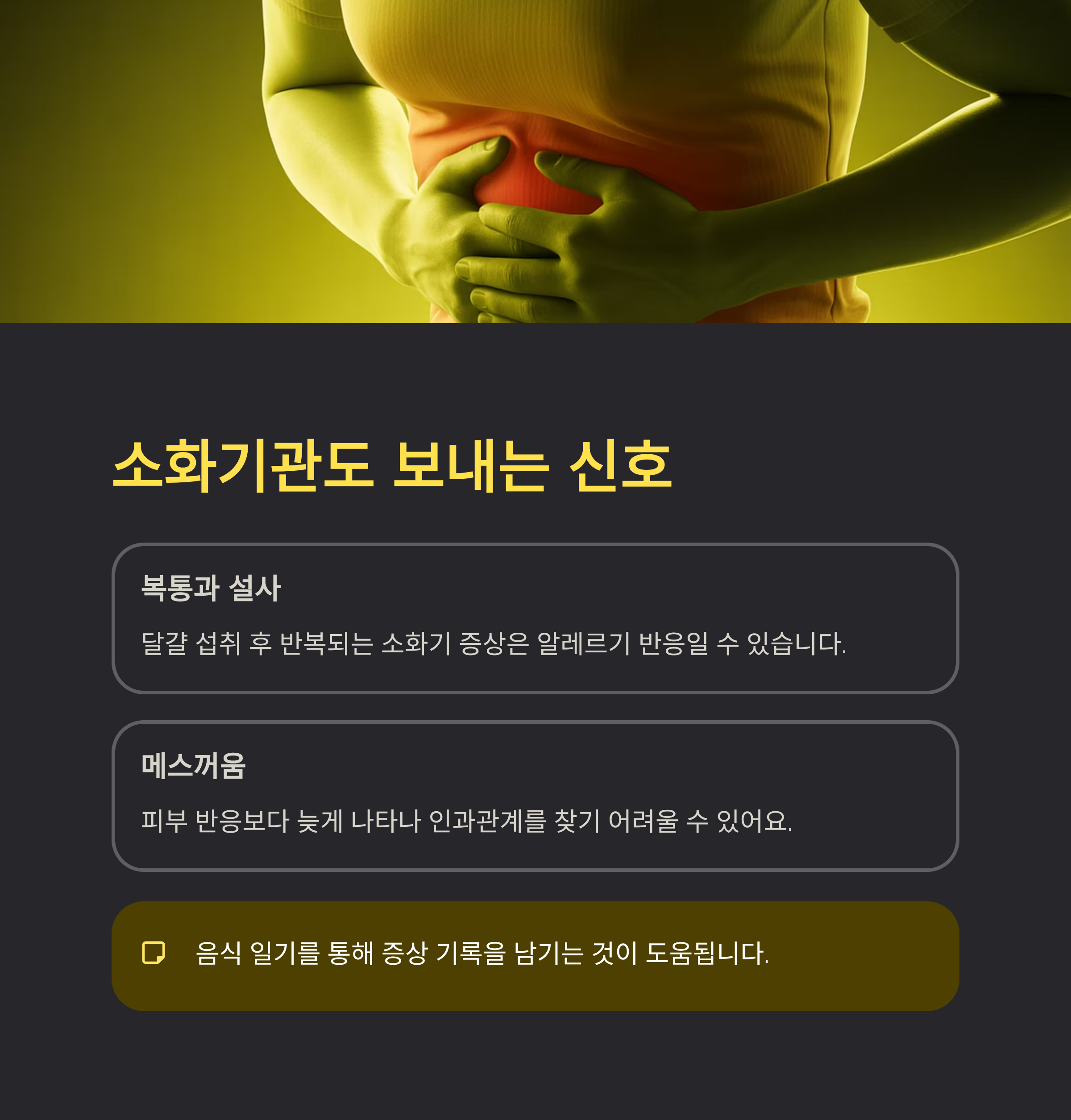 소화기 증상은 피부 반응보다 더 늦게 나타날 수 있어 인과관계를 찾기 어렵지만, 음식 일기를 통해 증상 기록을 남기는 것이 도움이 됩니다.