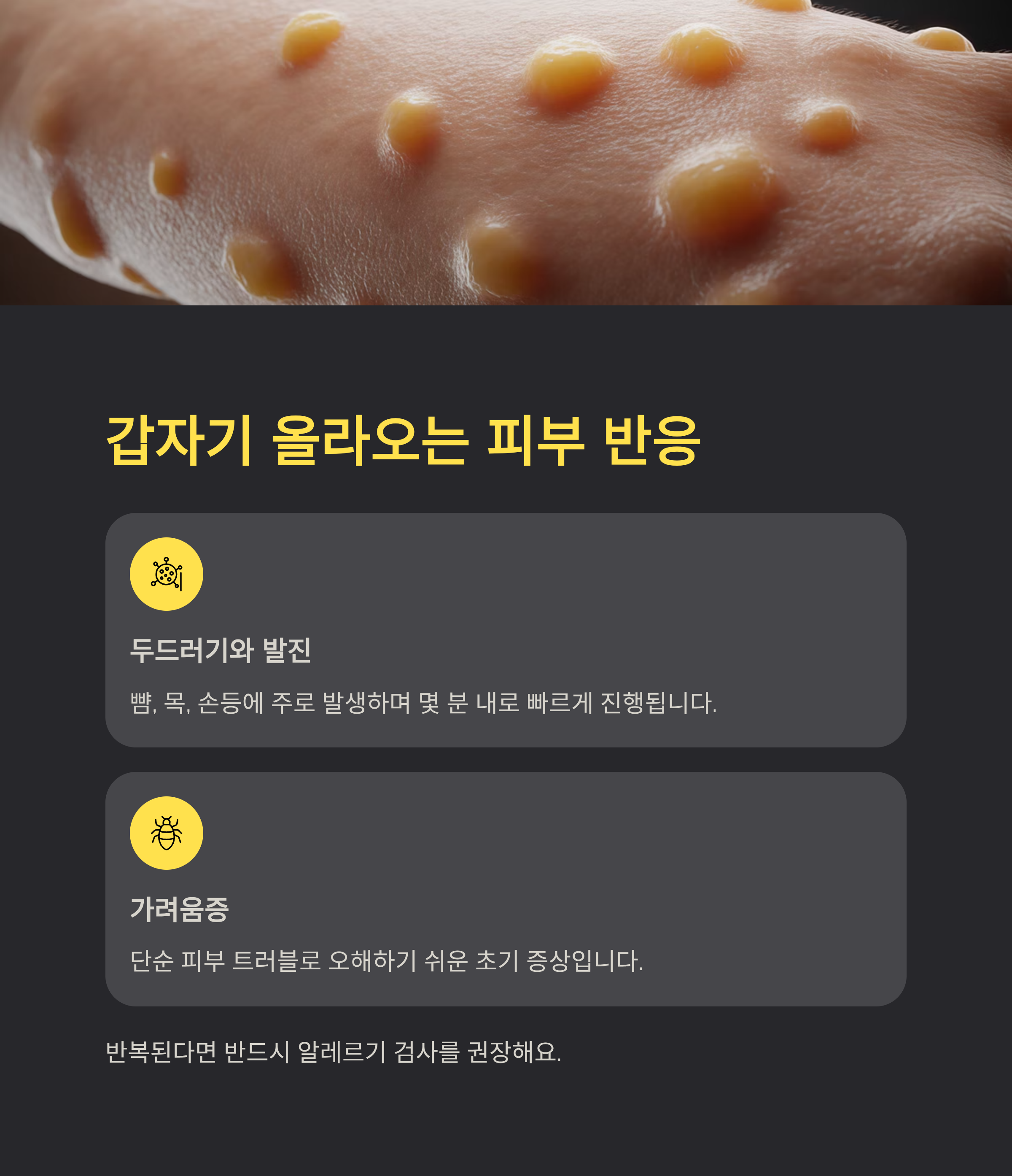 초기에는 피부 반응만 나타나더라도, 점점 전신 증상으로 확대될 수 있다는 걸 기억하세요.