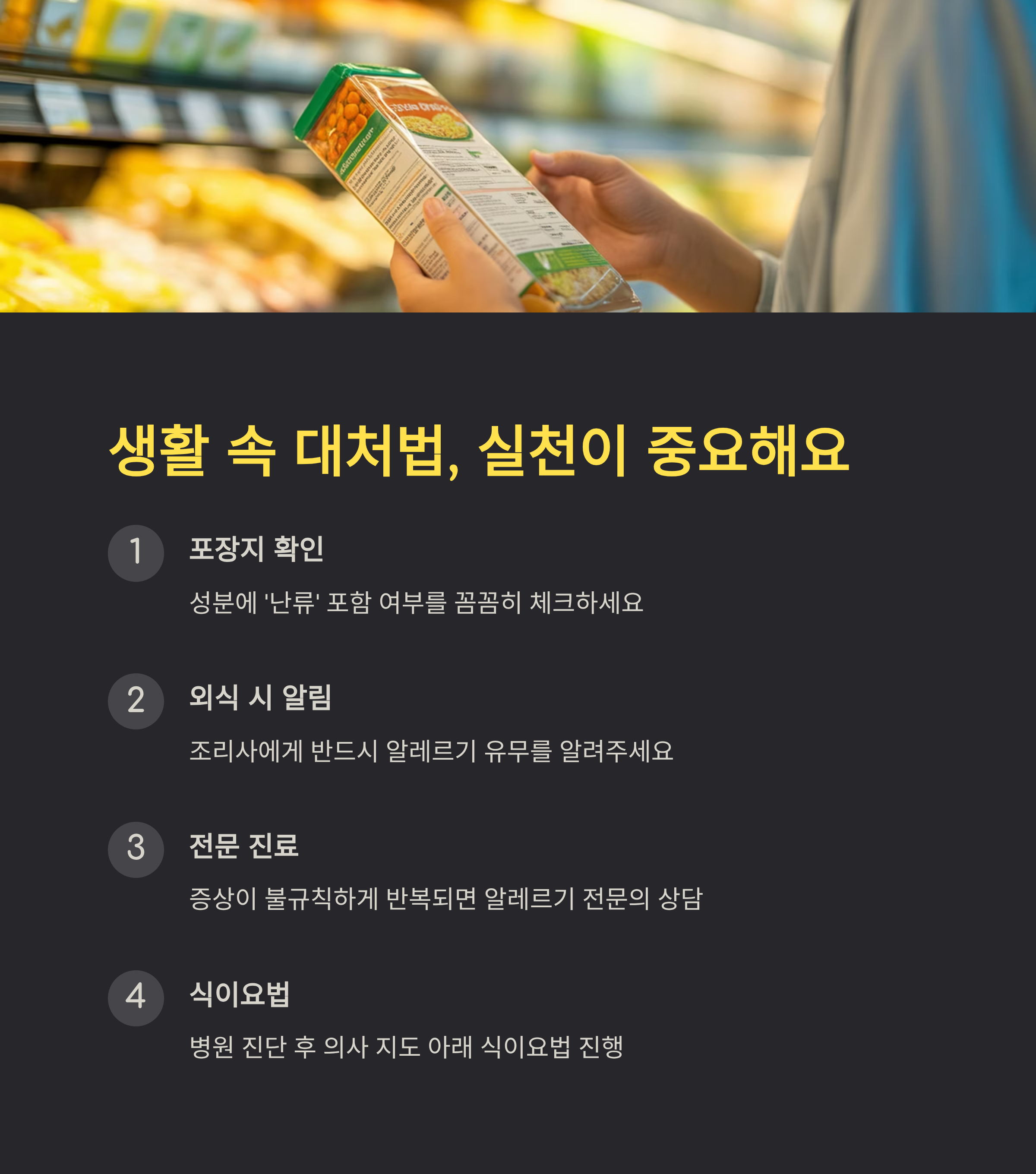 1. 포장지를 꼼꼼히 확인하고, 성분에 ‘난류’가 포함되어 있는지 체크하세요