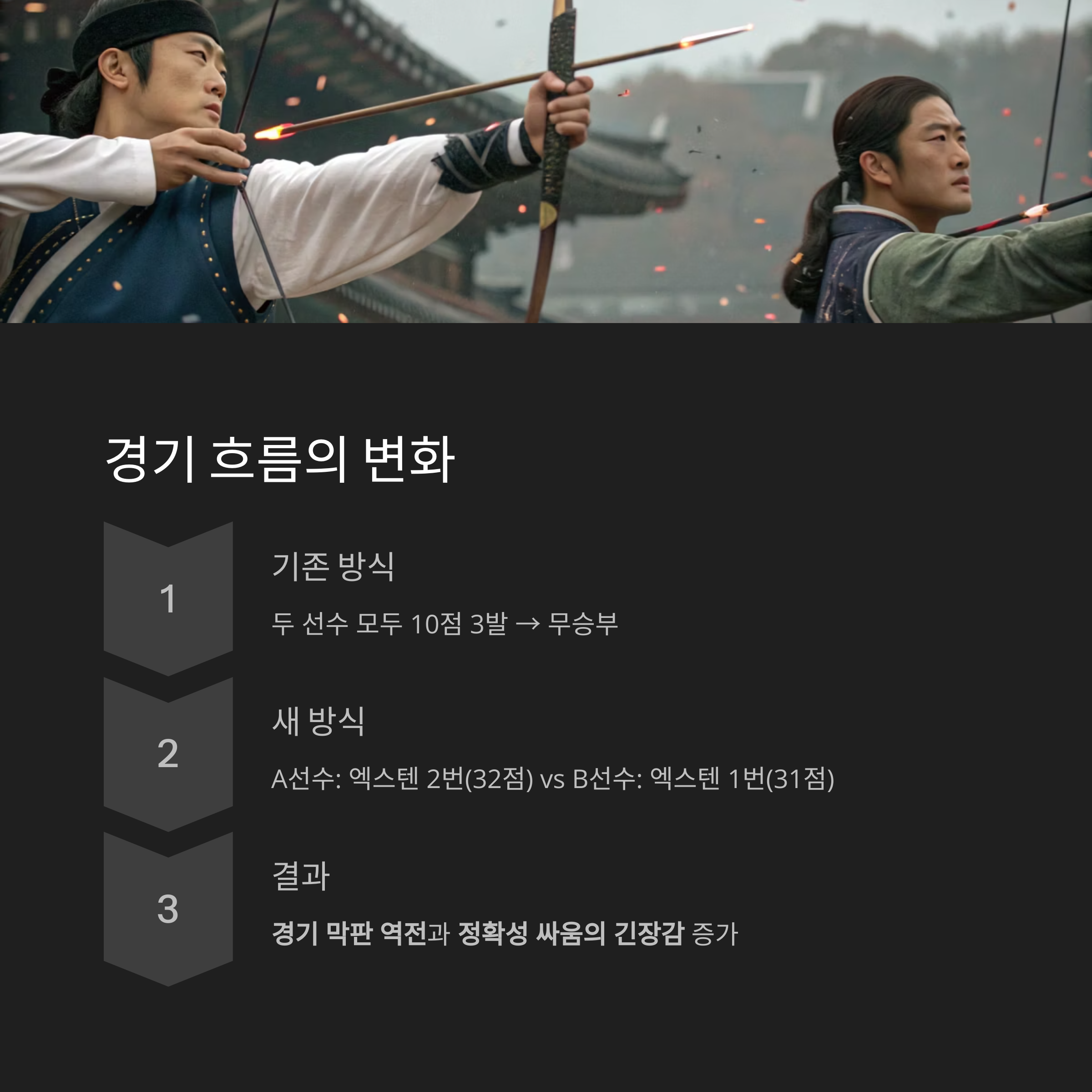 양궁의 미세한 정확도가 실제 경기 결과에 더 강하게 반영됩니다.