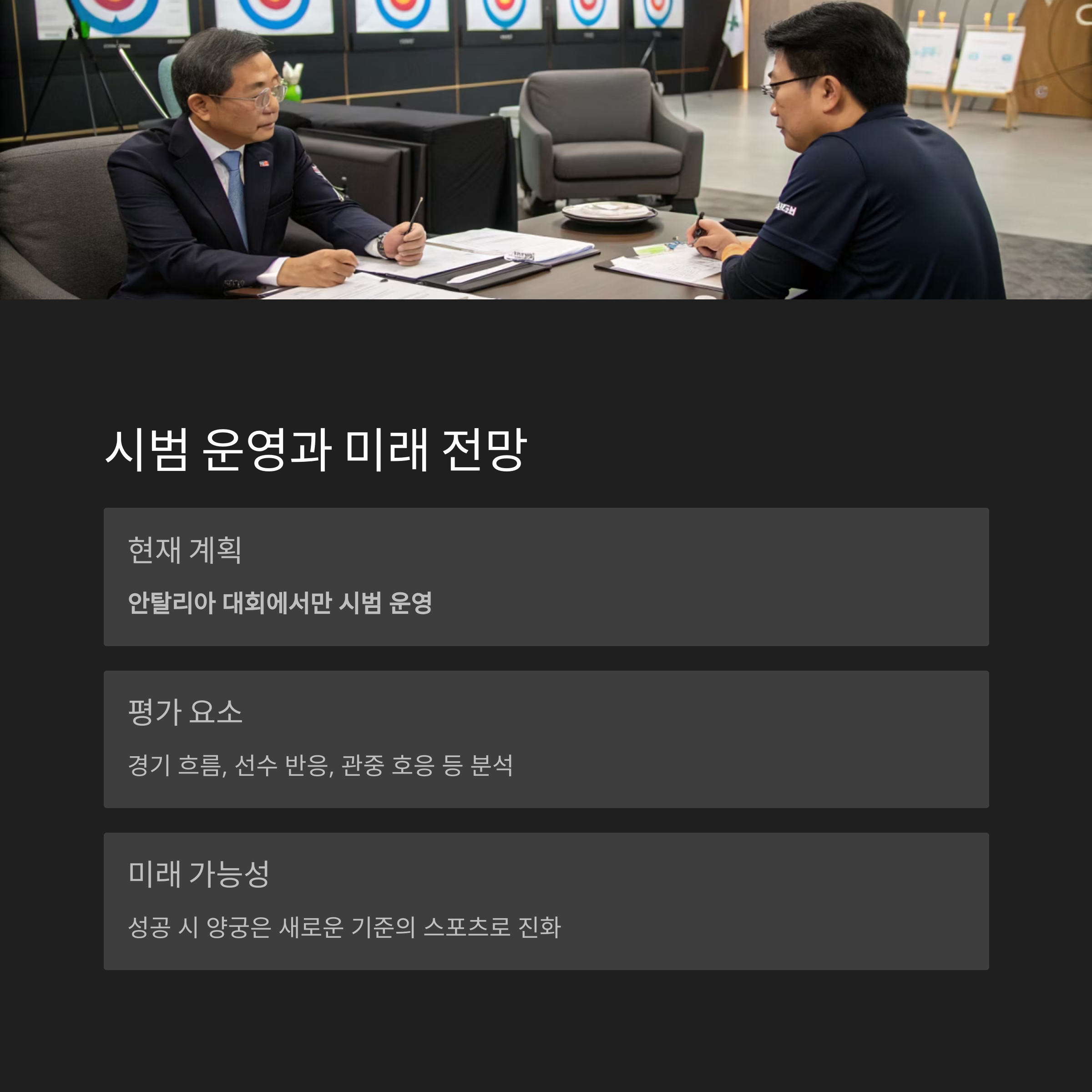 이후 세계양궁연맹은 경기 흐름, 선수 반응, 관중 호응 등을 분석해