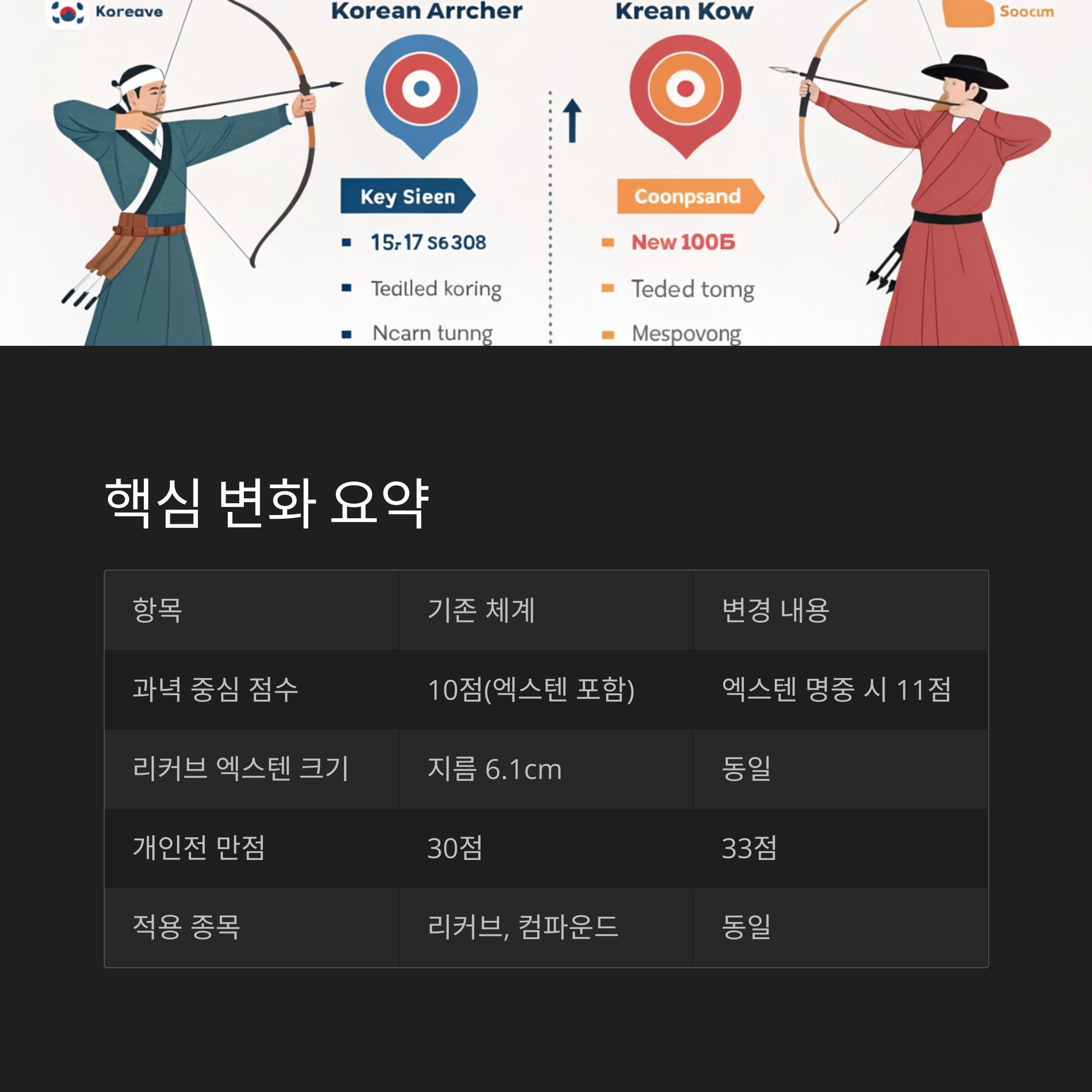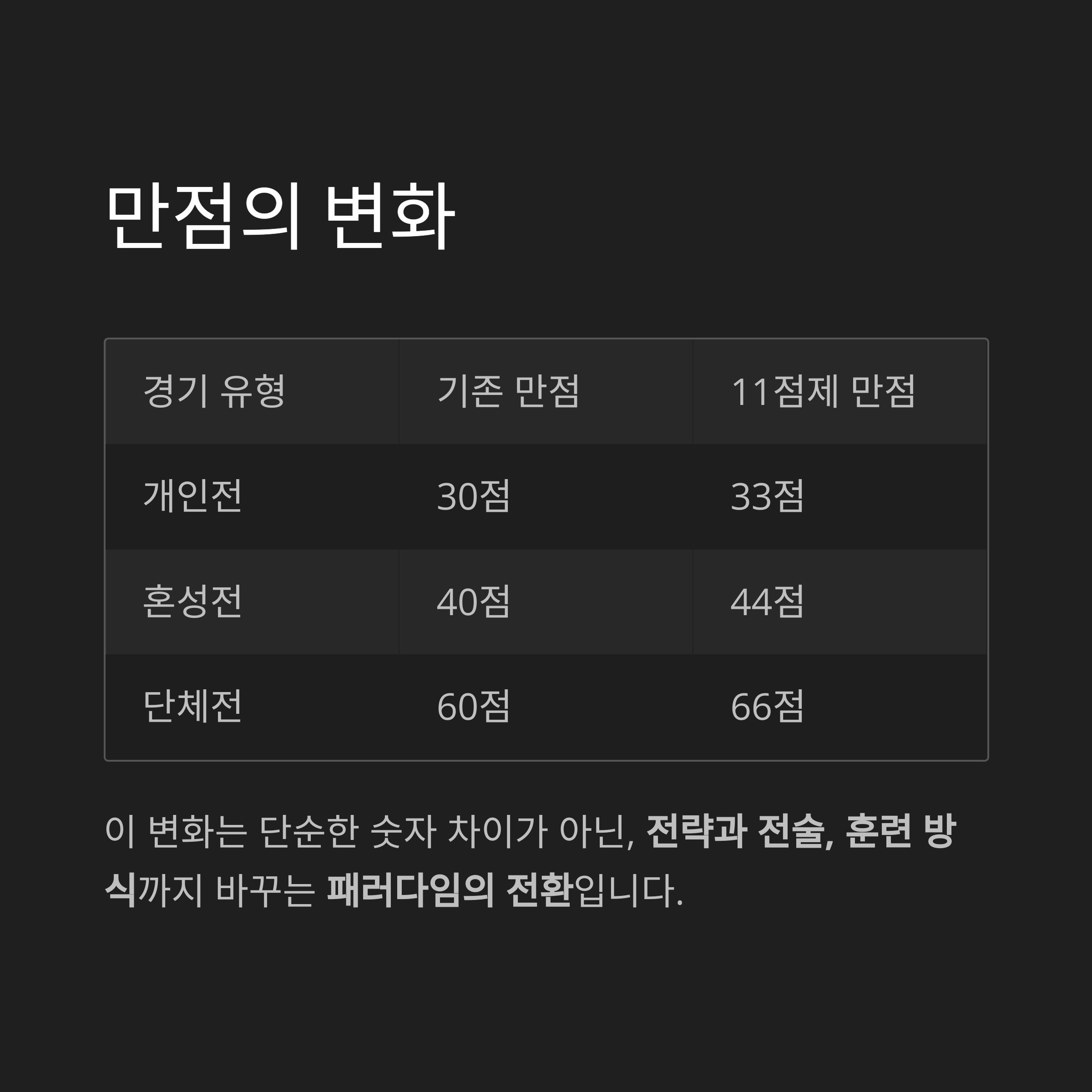 | 경기당 만점 변화 | 개인 30 / 혼성 40 / 단체 60 | 개인 33 / 혼성 44 / 단체 66 |