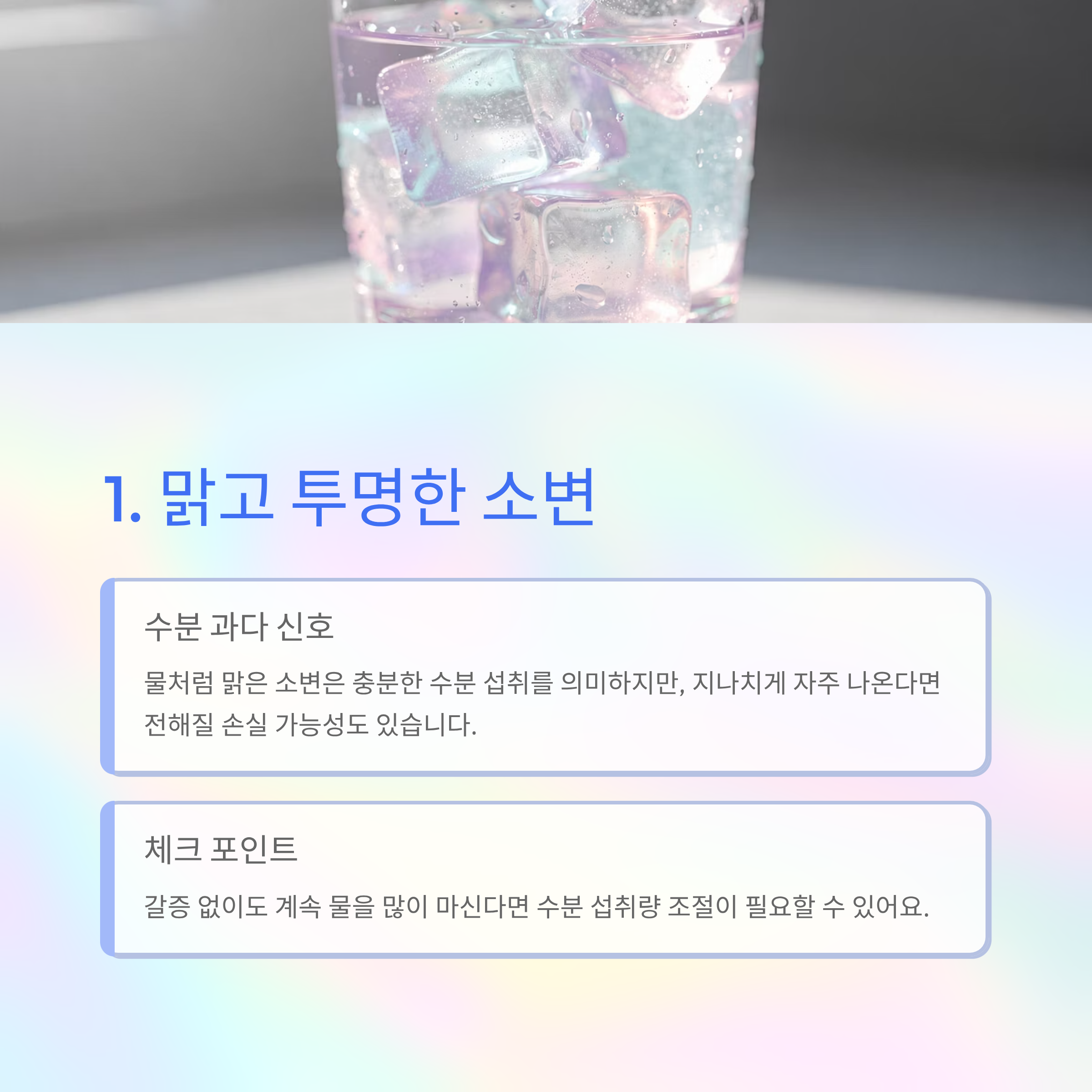 지속적으로 맑은 소변이 나올 때는 수분 섭취량을 점검해보고, 갈증이 없음에도 계속 물을 많이 마시고 있다면 잠시 조절이 필요할 수 있습니다.