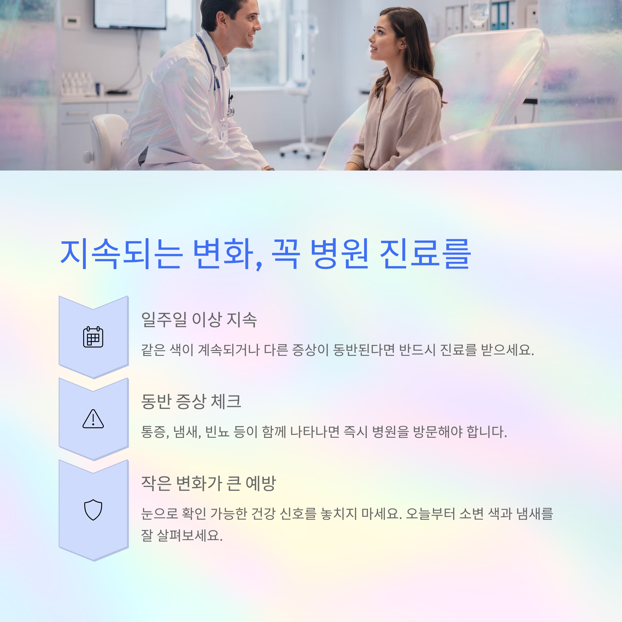 하루 이틀의 일시적인 변화는 큰 문제일 가능성이 낮지만, 일주일 이상 같은 색이 계속되거나 다른 증상(통증, 냄새, 빈뇨 등)이 동반된다면 반드시 진료를 받아야 합니다.