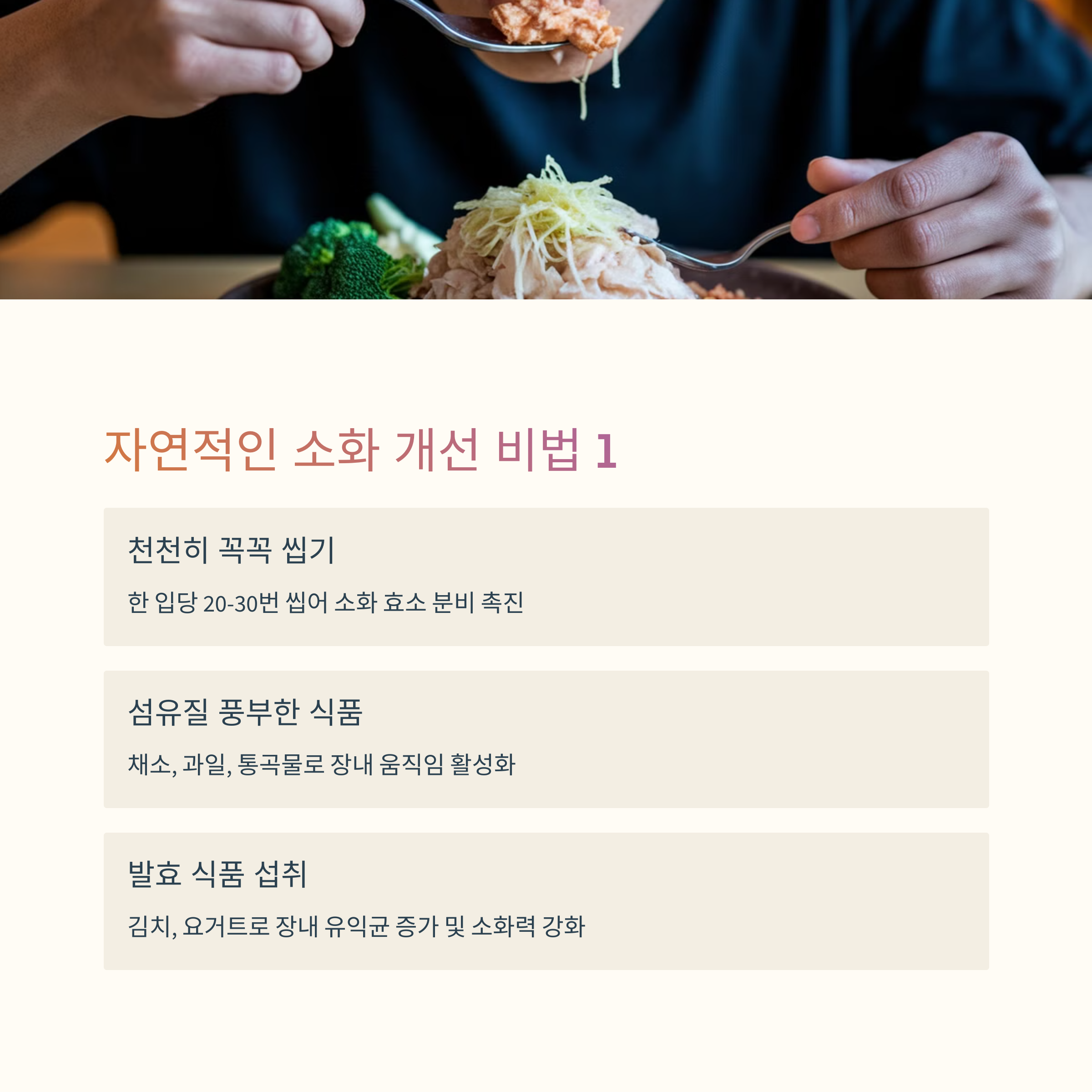 | 자연적인 소화 방법 | 올바른 식습관, 운동, 발효식품 섭취 등 일상 속 실천으로 소화력을 높입니다. |