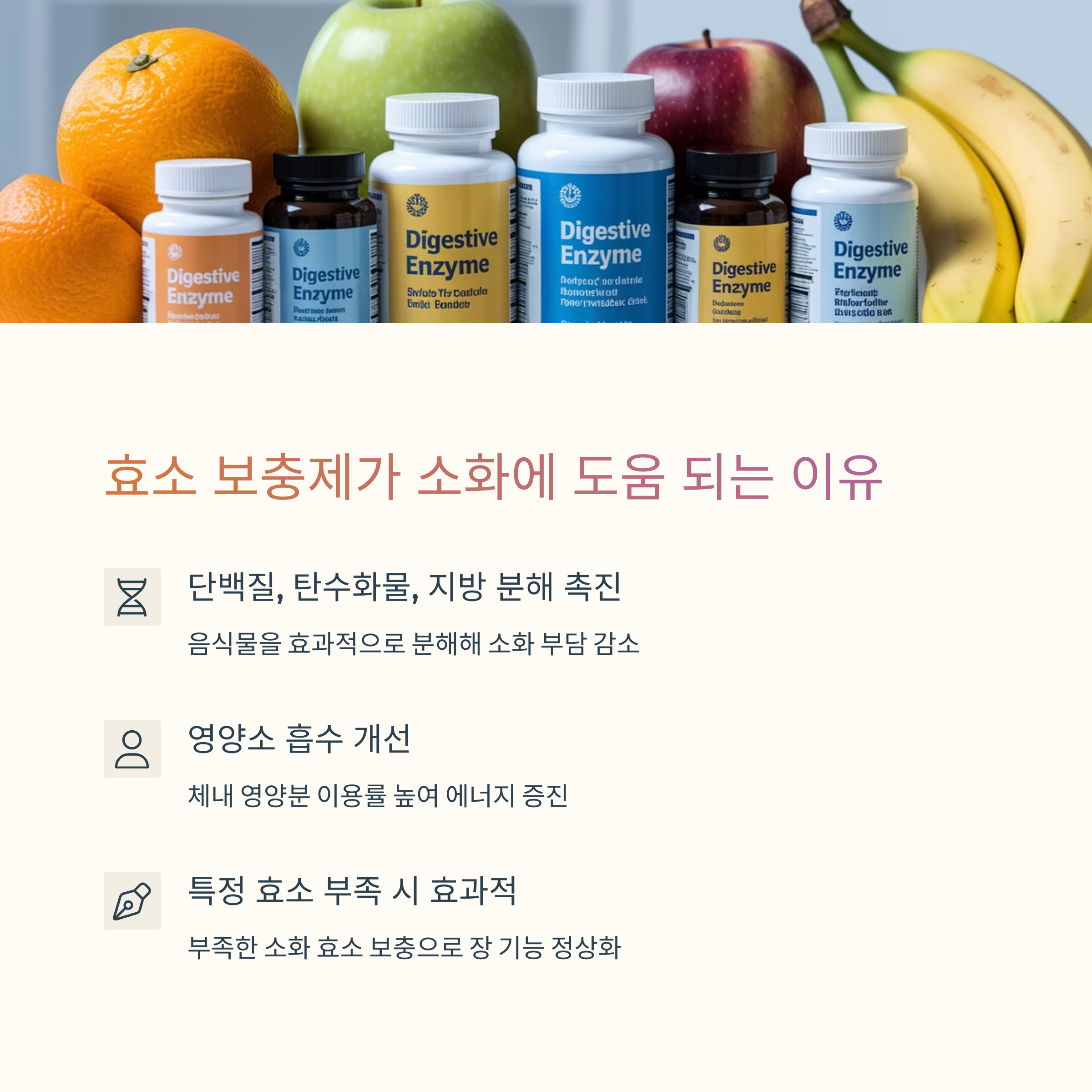 효소 보충제는 식사 중 복용 시 가장 효과적이지만, 장기 복용 시 체내 자연 효소 분비 감소 가능성이 있으므로 전문가 상담이 필요합니다.