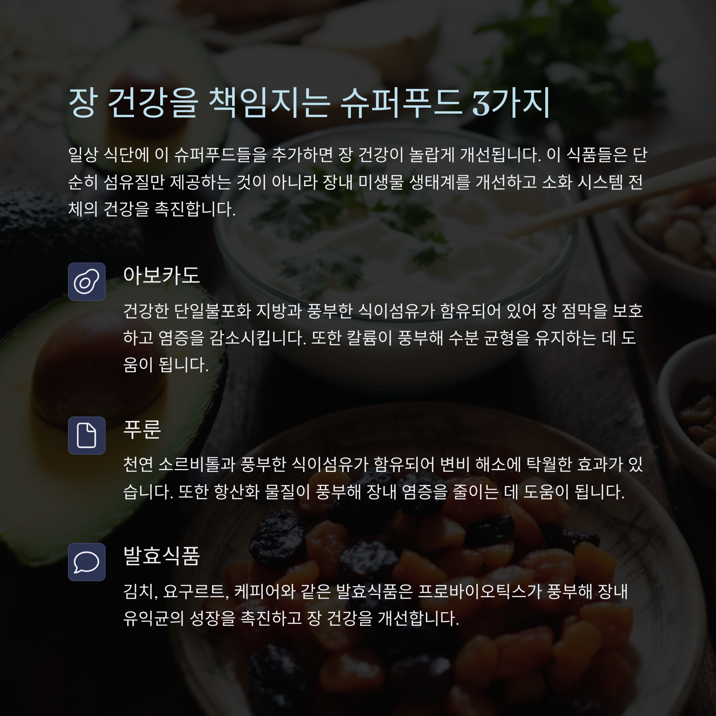 장 건강은 단지 소화에 국한된 문제가 아니라 우리 몸 전체의 균형과 밀접하게 연결되어 있습니다. 좋은 식이섬유와 효소가 풍부한 음식을 꾸준히 섭취하면 배변 리듬이 안정되고 속이 편안해지며, 전반적인 건강 수준도 향상됩니다. 특히 자연에서 온 식품을 바탕으로 식단을 구성하는 것이 중요하며, 가공되지 않은 채소, 과일, 통곡물, 발효식품 등을 선택하는 습관은 평생 지속 가능한 건강관리의 기초가 됩니다. 오늘 소개한 식품들을 식탁에 하나씩 추가해 보세요. 하루하루 쾌변과 함께 더 가벼운 몸과 마음을 경험하실 수 있을 것입니다.