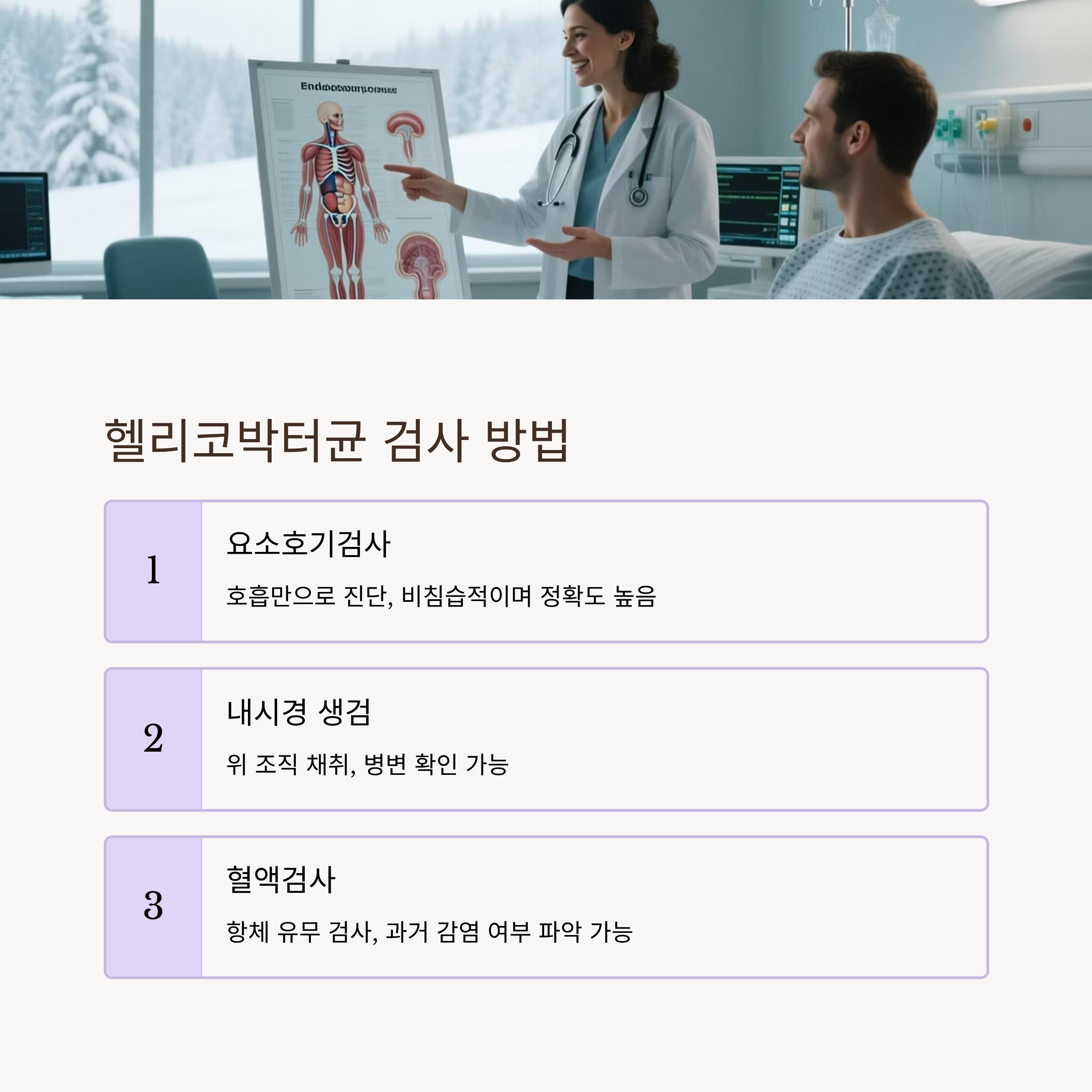 병원에서는 다음과 같은 방법으로 헬리코박터균 감염 여부를 확인합니다.