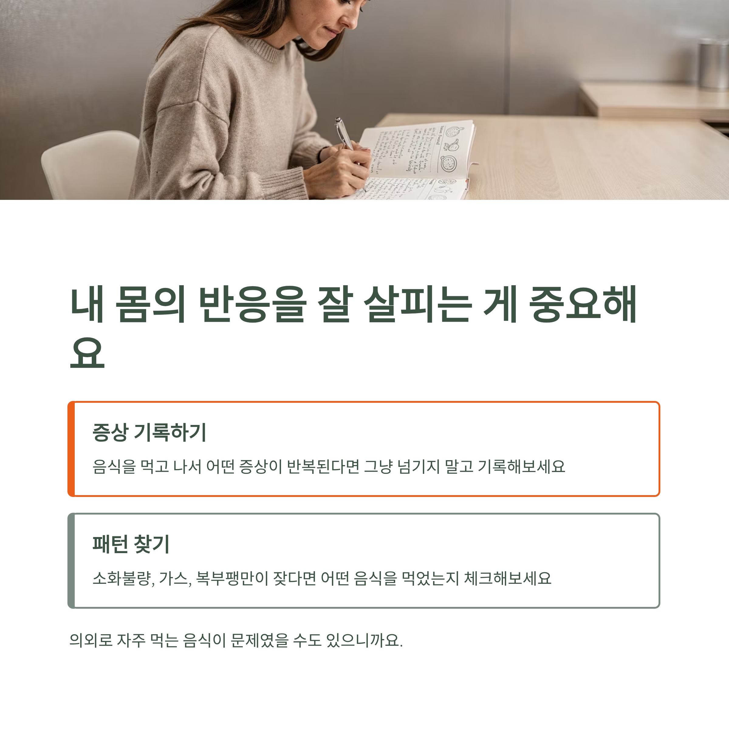 음식을 먹고 나서 어떤 증상이 반복된다면 그냥 넘기지 말고 기록해보는 것도 좋은 방법이에요.