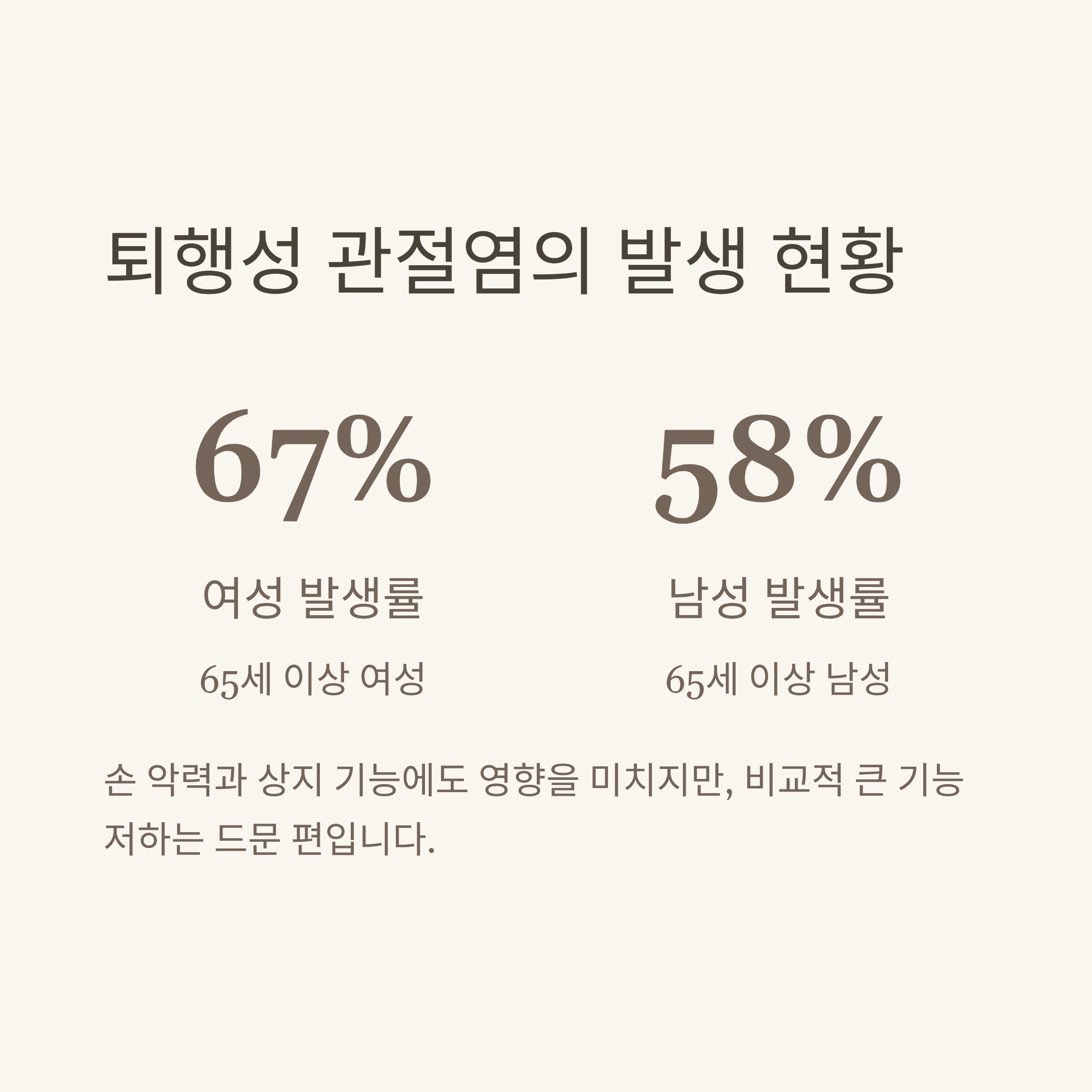 퇴행성 관절염은 65세 이상에서 여성 약 67%, 남성 약 58%에서 발견됩니다.