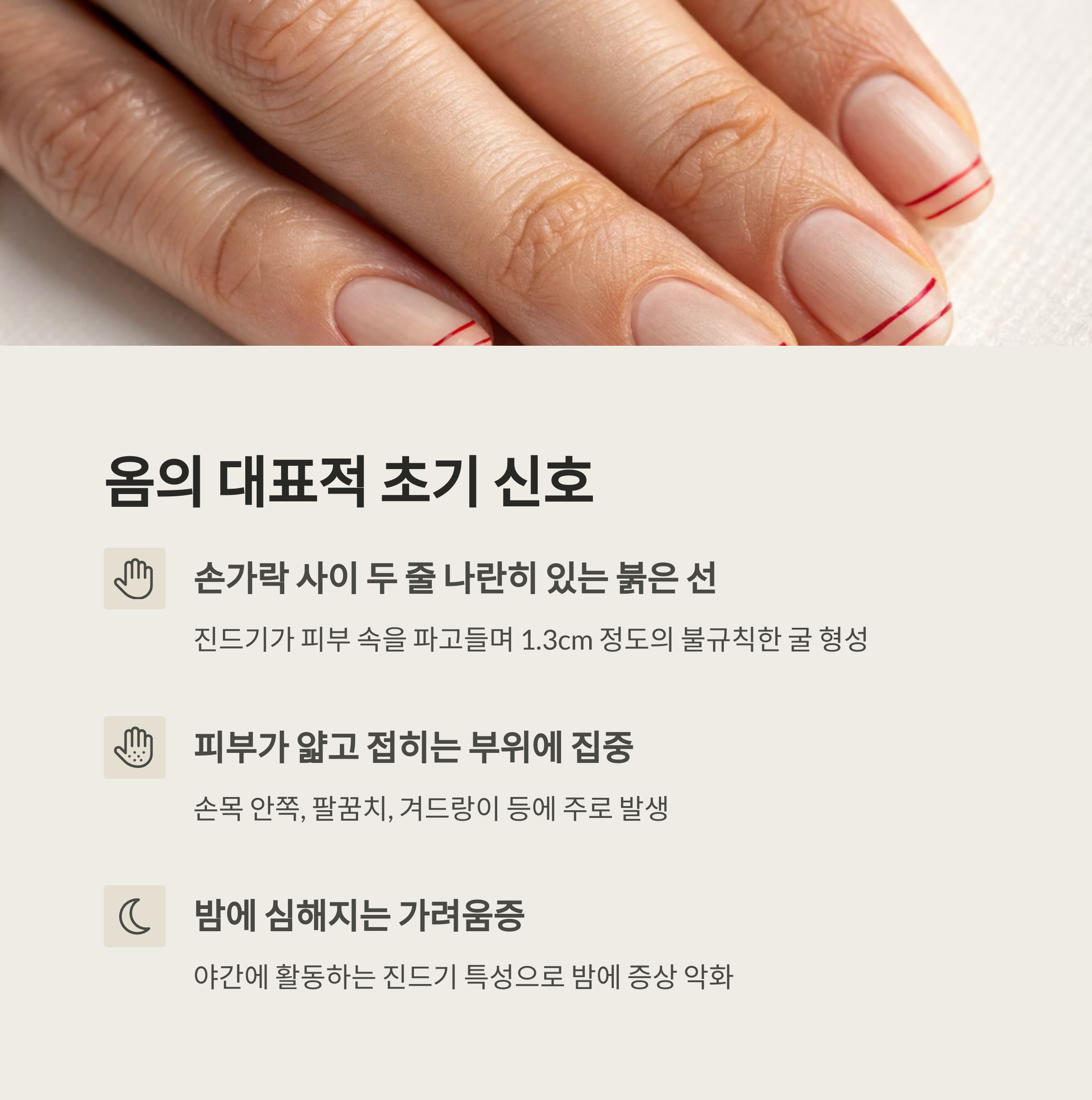 옴 감염의 가장 대표적인 초기 신호입니다.