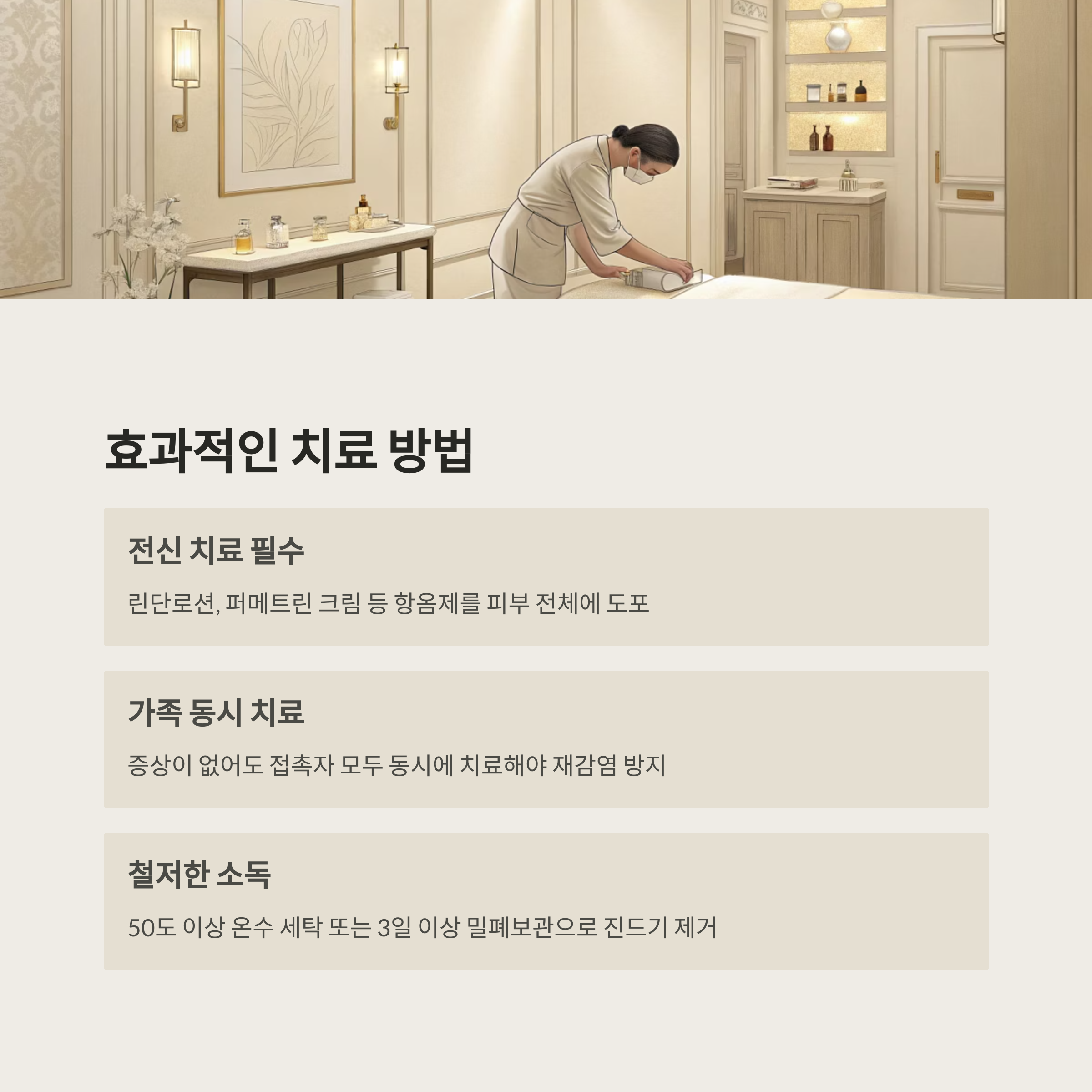 | 치료제 사용 | 린단로션, 퍼메트린 크림 등 전신 도포제 사용 |