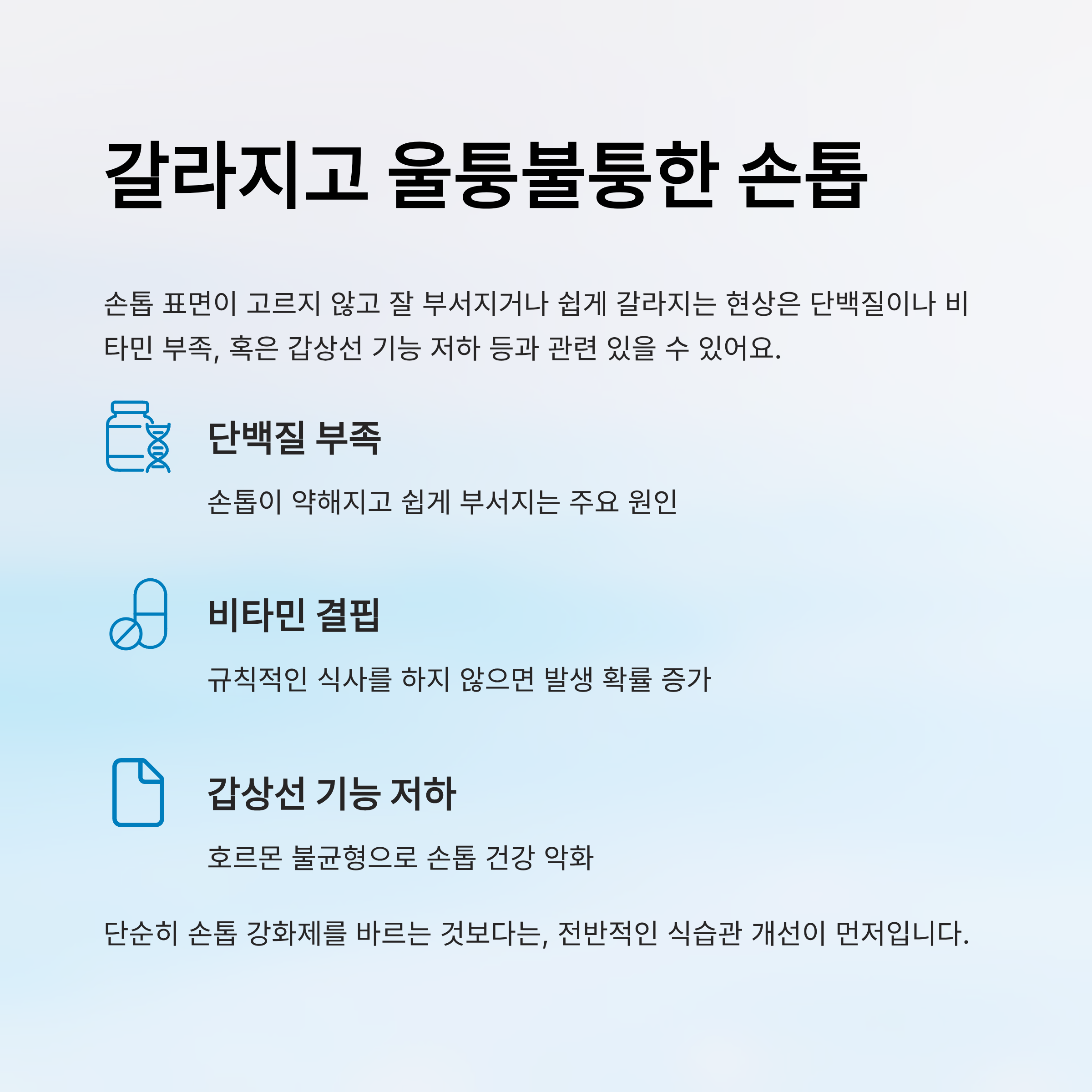 손톱을 길러도 금방 갈라지고 자주 부러진다면, 단순한 미용 문제가 아닌 건강 이상일 수 있습니다.