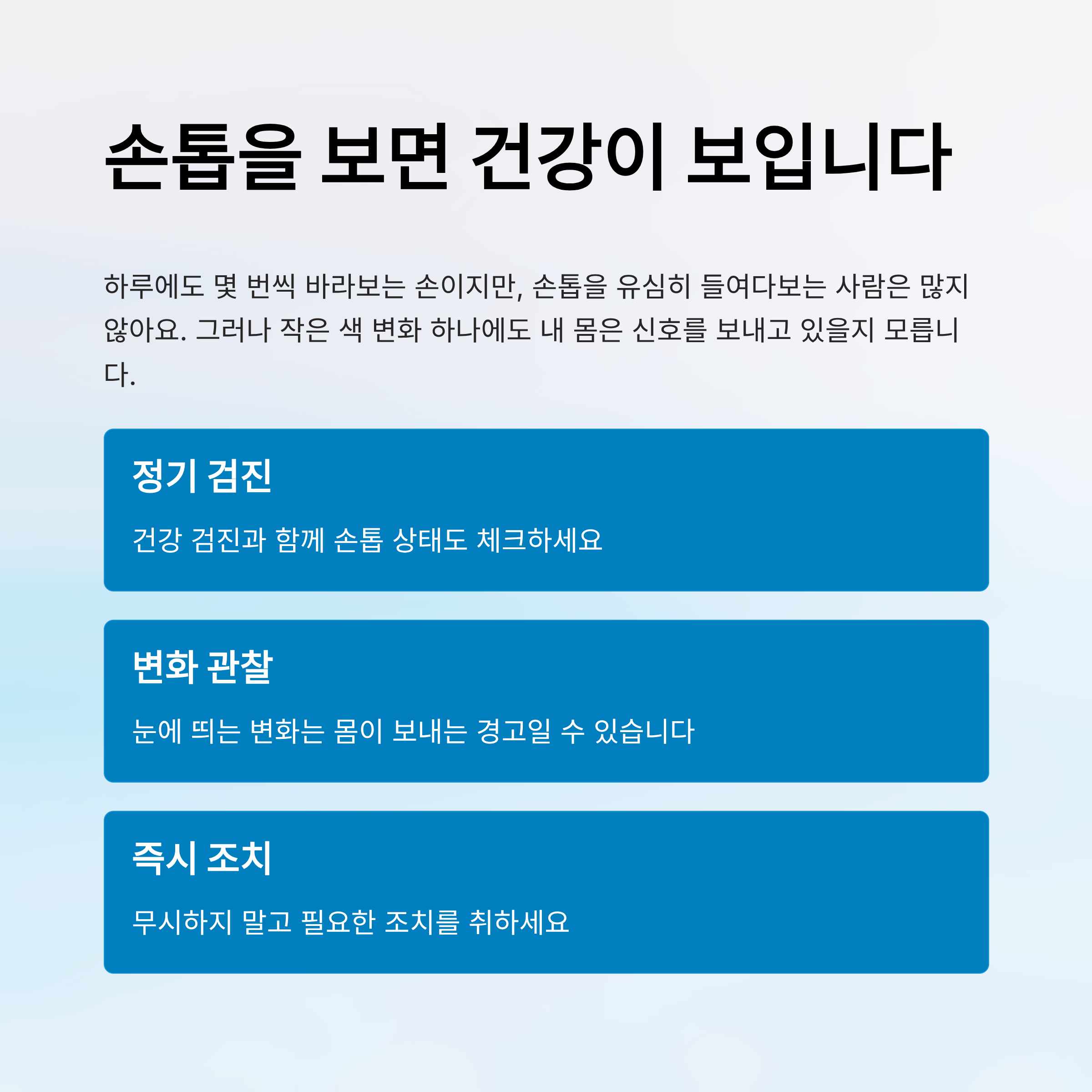손톱은 시간이 지나면서 조금씩 변화하는 만큼, 평소 자주 살펴보는 습관이 필요해요.