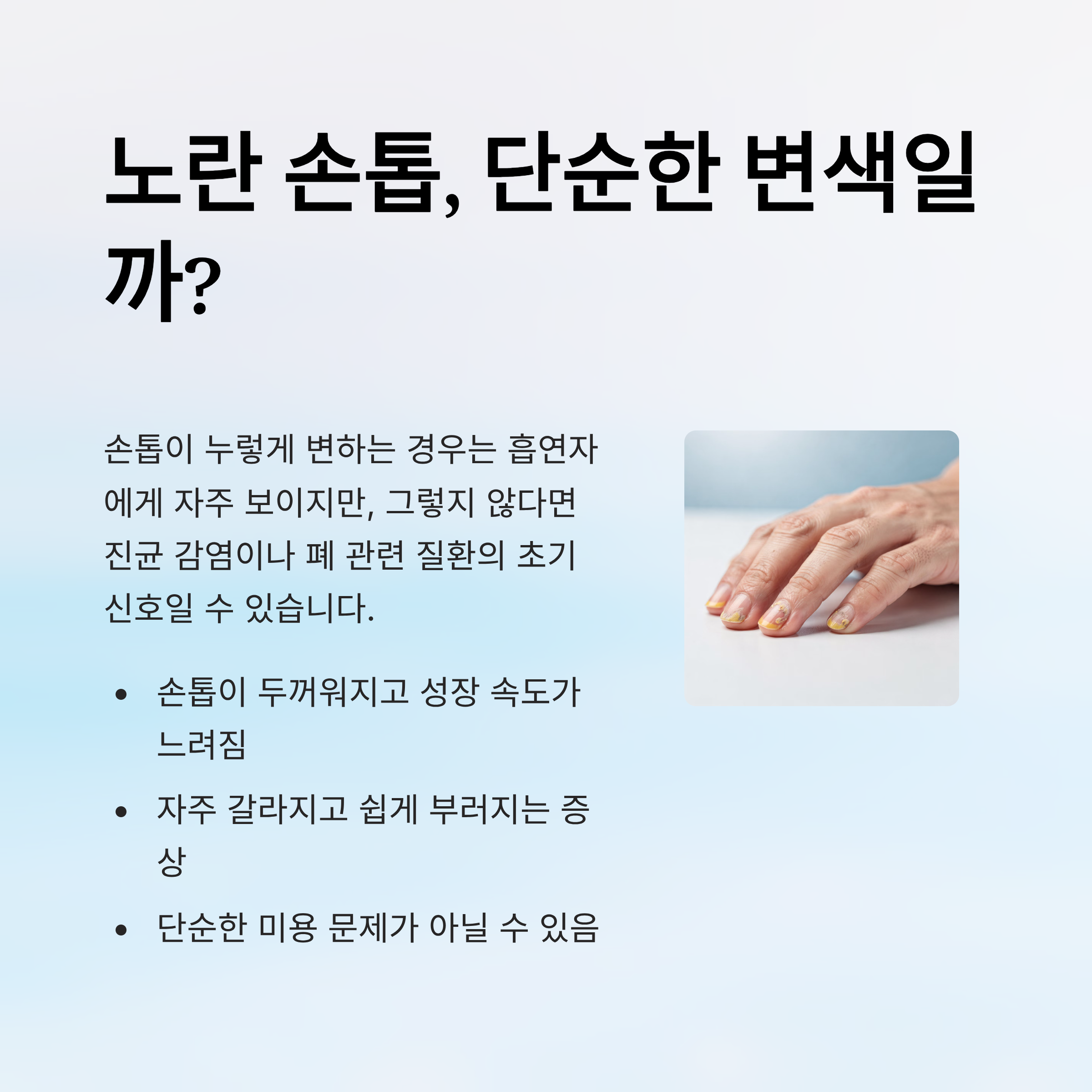 손톱이 누렇게 변하는 경우는 흡연자에게 자주 보이기도 하지만, 그렇지 않은 분이라면 진균 감염이나 폐 관련 질환의 초기 신호일 수 있습니다. 특히 손톱이 두꺼워지고 성장 속도가 느려지면서 노랗게 변한다면 주의가 필요해요.