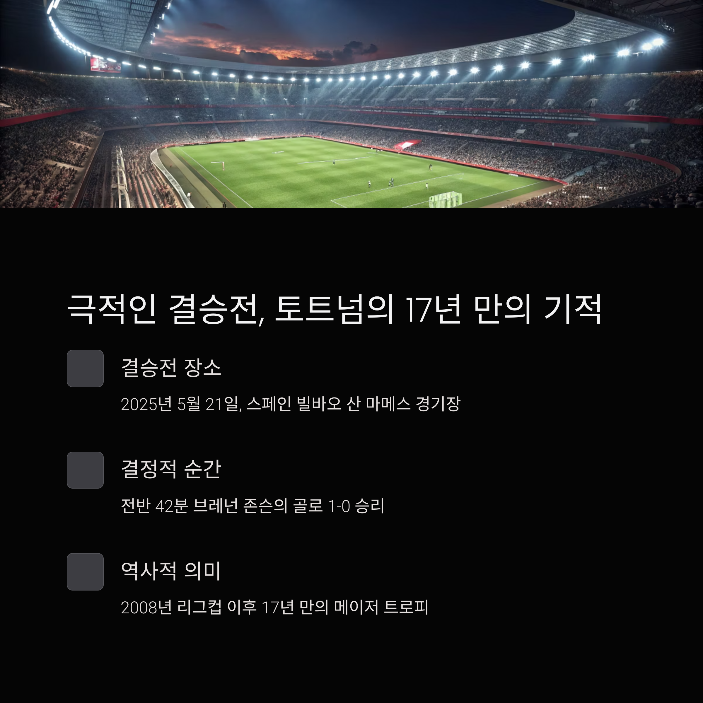 토트넘은 2025 UEFA 유로파리그 결승전에서 맨유를 1-0으로 꺾으며