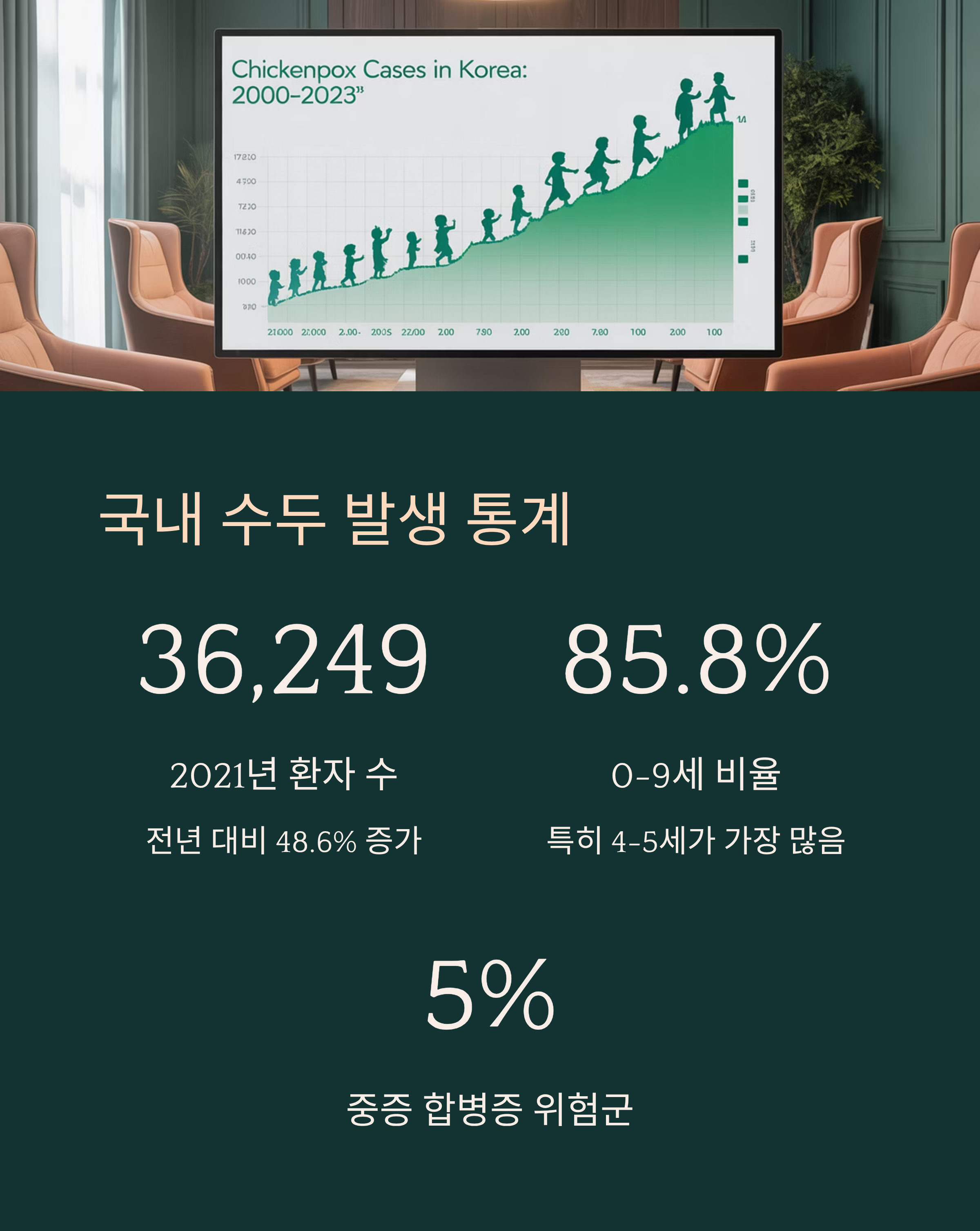 2021년 기준, 국내 수두 환자 수는 36,249명으로 전년도보다 약 48.6% 증가했습니다.