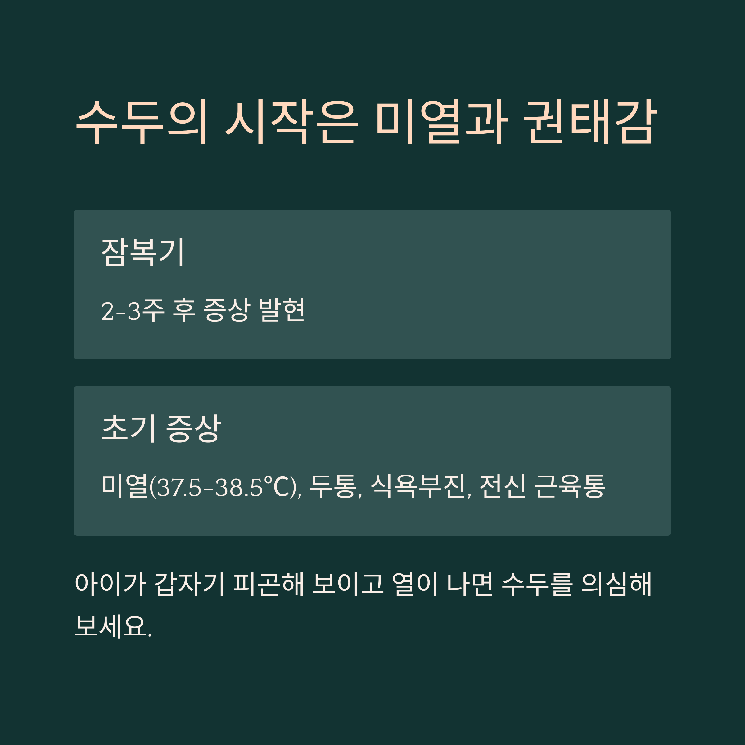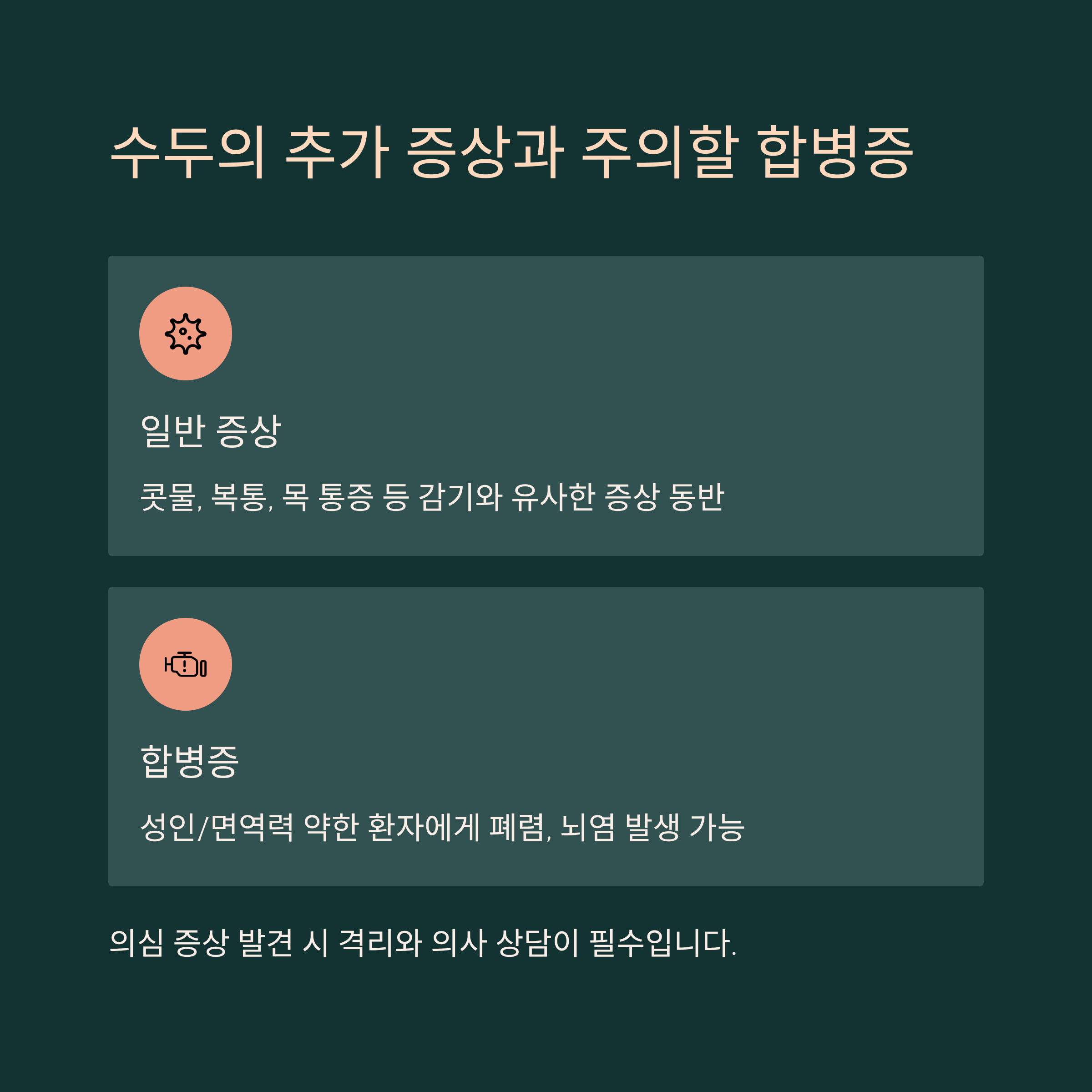 수두는 기본적으로 콧물, 복통, 목 통증 등 감기와 유사한 증상도 동반할 수 있습니다.