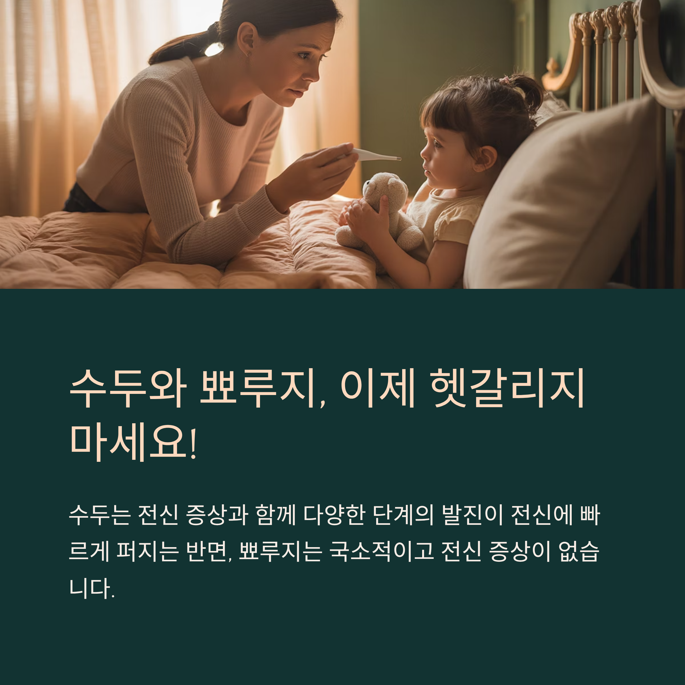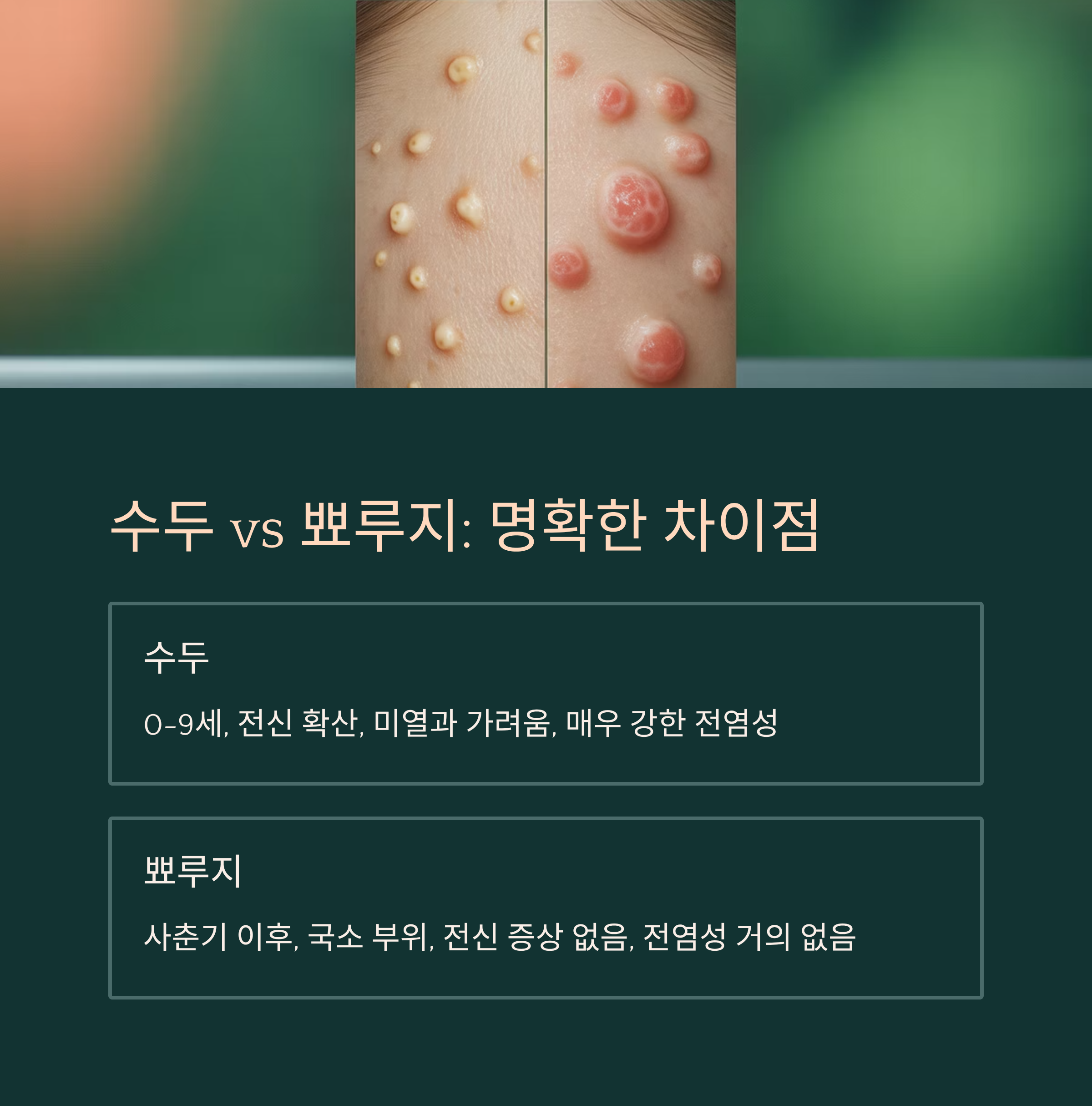 수두와 뾰루지는 겉보기에는 비슷해 보여도 증상과 진행 방식, 전염력까지 완전히 다릅니다. 특히 아이들에게 흔히 나타나는 수두는 초기 미열과 가려움, 다양한 단계의 발진이 함께 나타나며 빠르게 확산됩니다. 반면 뾰루지는 국소적이고 고립된 형태로, 일반적으로 전신 증상은 없습니다. 이번 글에서는 수두의 주요 증상과 발진 특성을 정확히 살펴보고, 일반적인 여드름이나 뾰루지와 어떻게 구별할 수 있는지 핵심 정보와 데이터를 정리했습니다.