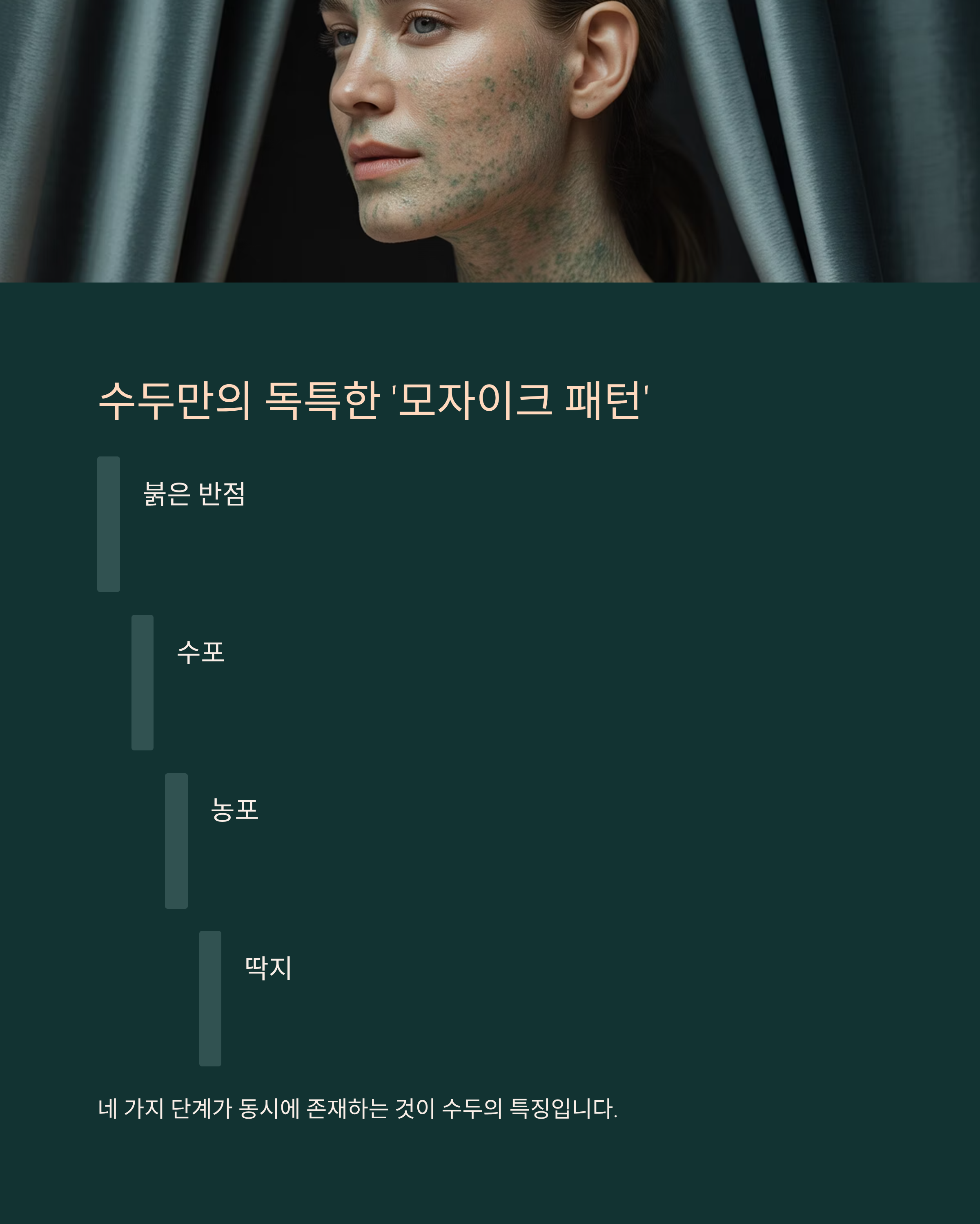 수두의 또 다른 핵심은 다양한 형태의 발진이 동시에 나타나는 모자이크 패턴입니다.