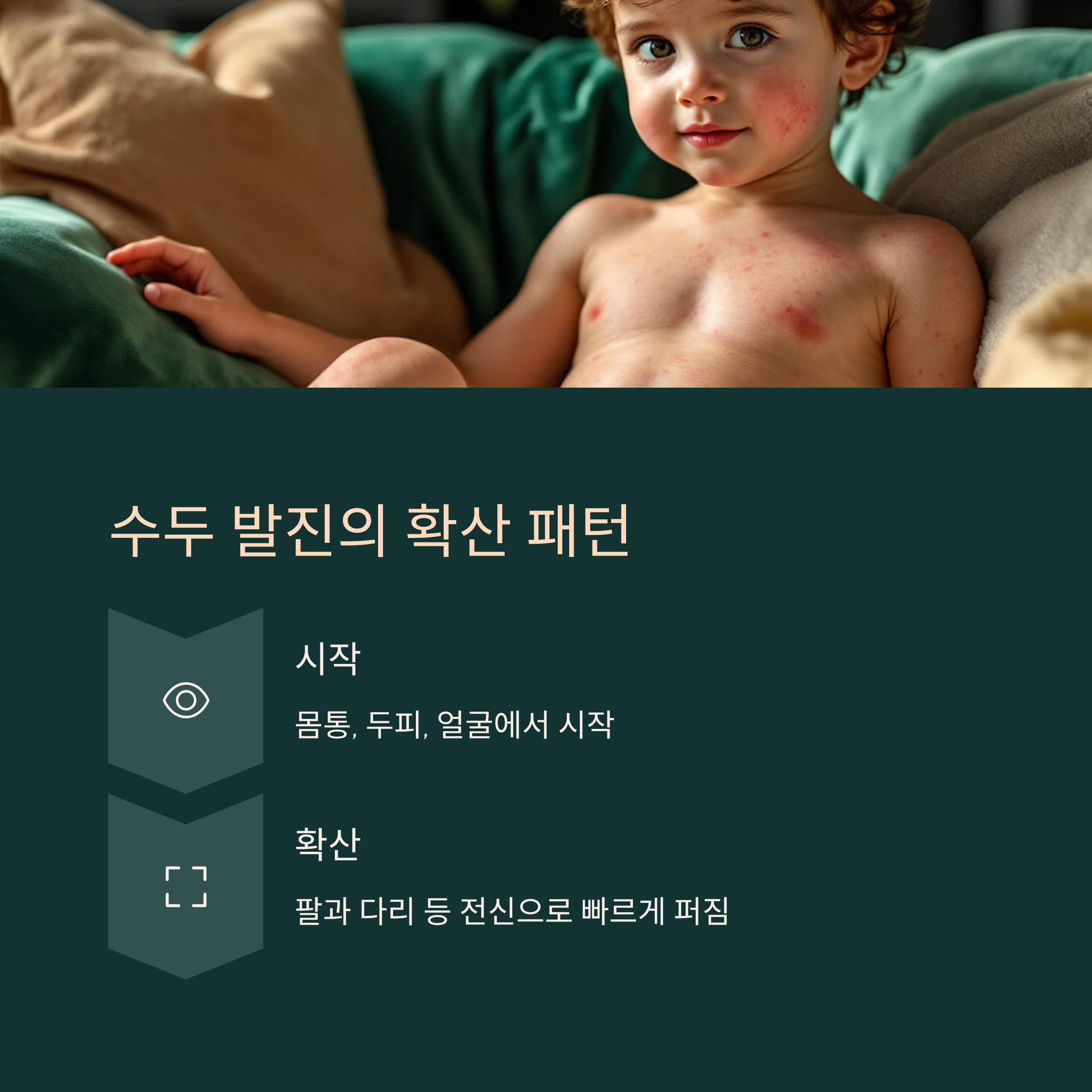 | 발진 시작 부위 | 몸통, 두피, 얼굴부터 전신 확산 | 턱, 이마, 볼 등 국소 |