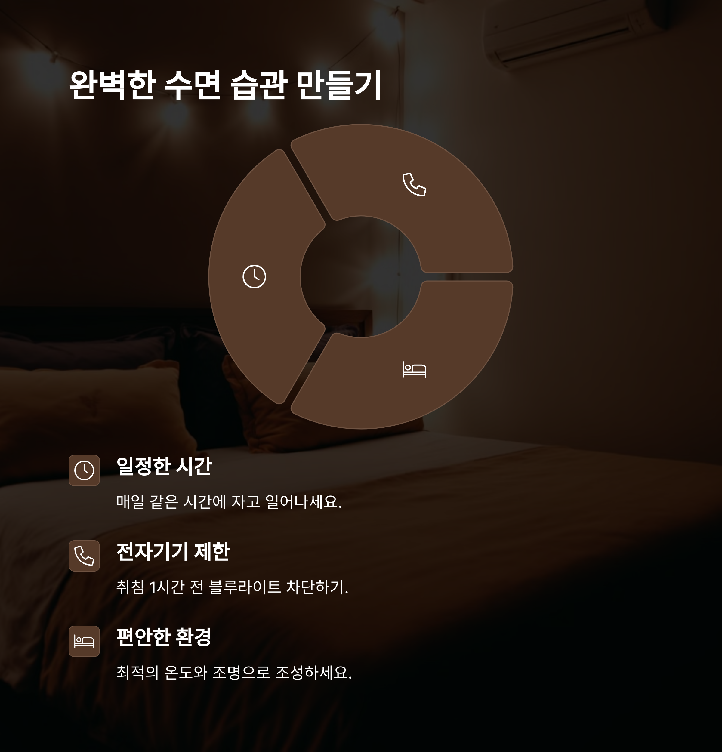 수면은 신체 회복과 정신 건강 유지에 필수적입니다. 규칙적인 수면 루틴을 지키면 면역력이 향상되고, 집중력이 높아지며, 기분도 안정됩니다.