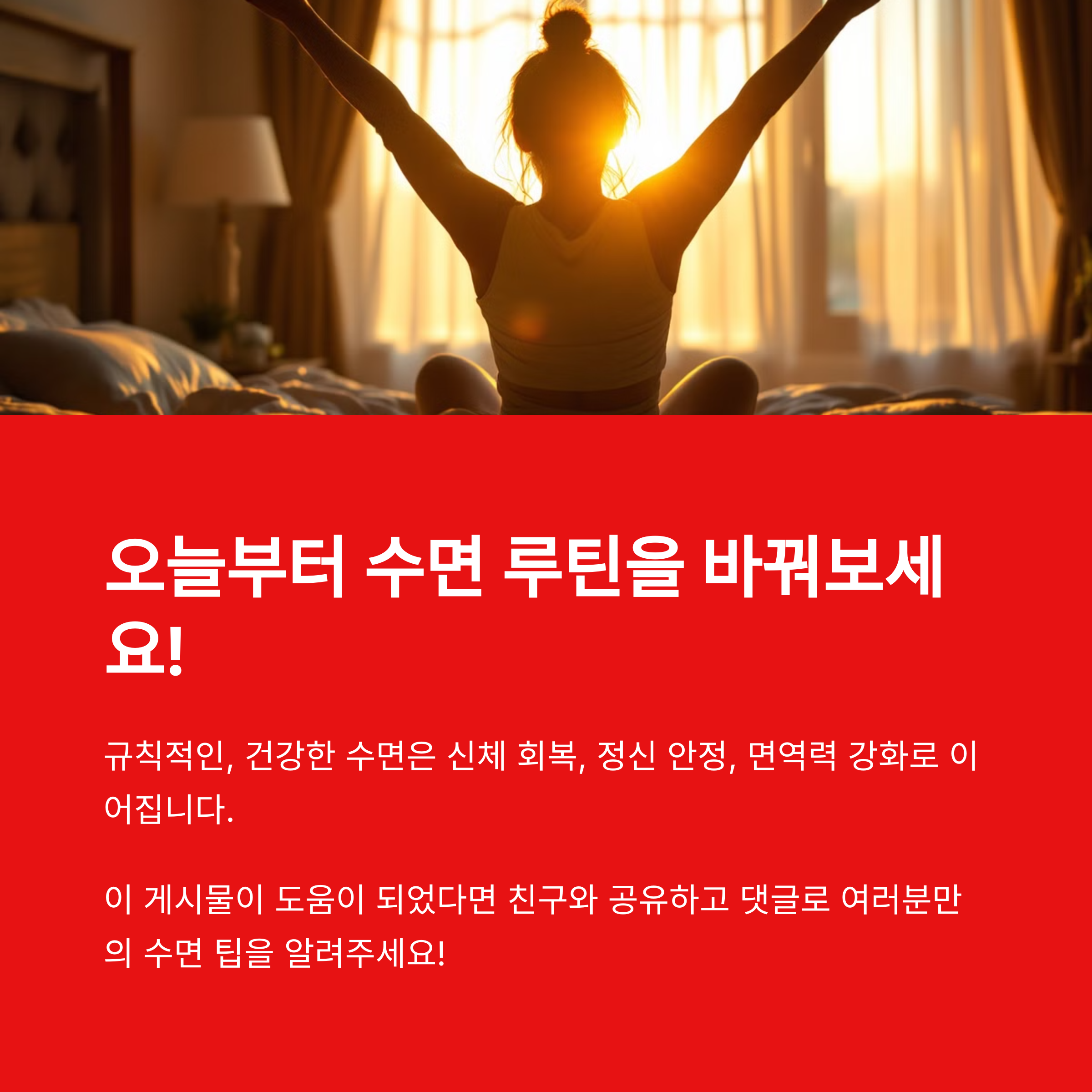 수면 루틴을 꾸준히 지키는 것이 얼마나 중요한지 이제 알게 되셨나요? 작은 변화로 수면을 개선할 수 있다는 점, 여러분도 실천해 보세요. 수면은 단순한 휴식의 시간이 아니라, 우리 몸과 마음을 치유하는 중요한 순간입니다. 건강한 수면을 위해 노력한다면, 일상에서 많은 긍정적인 변화를 경험할 수 있을 거예요. 여러분도 이제 좋은 수면 습관을 만들어 나가보세요!