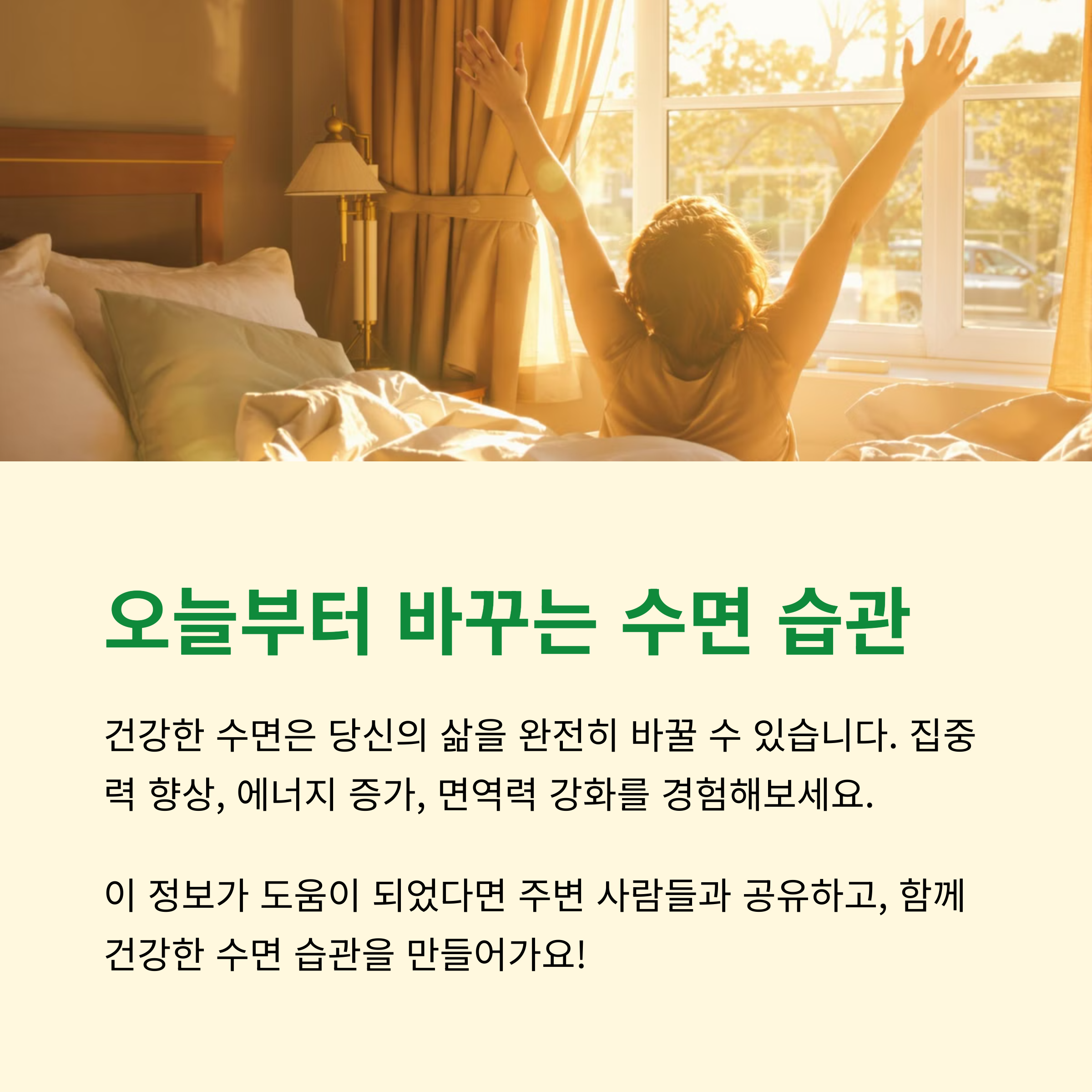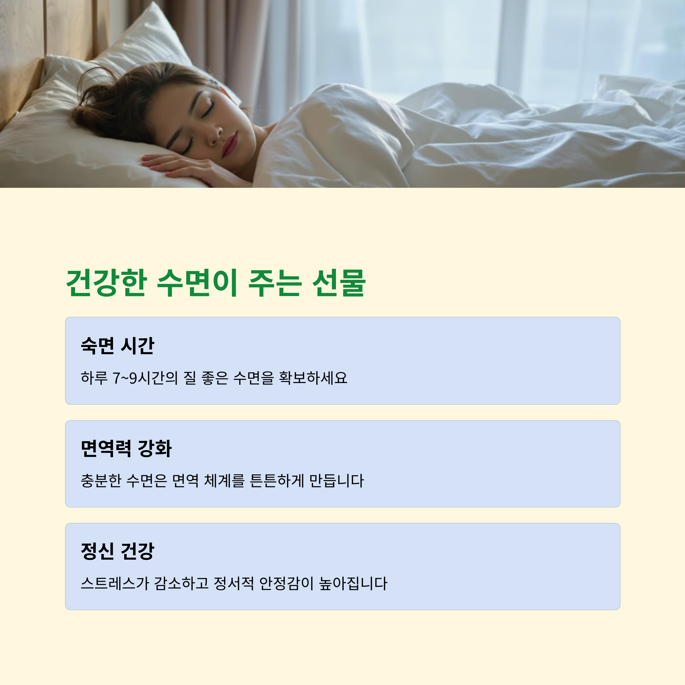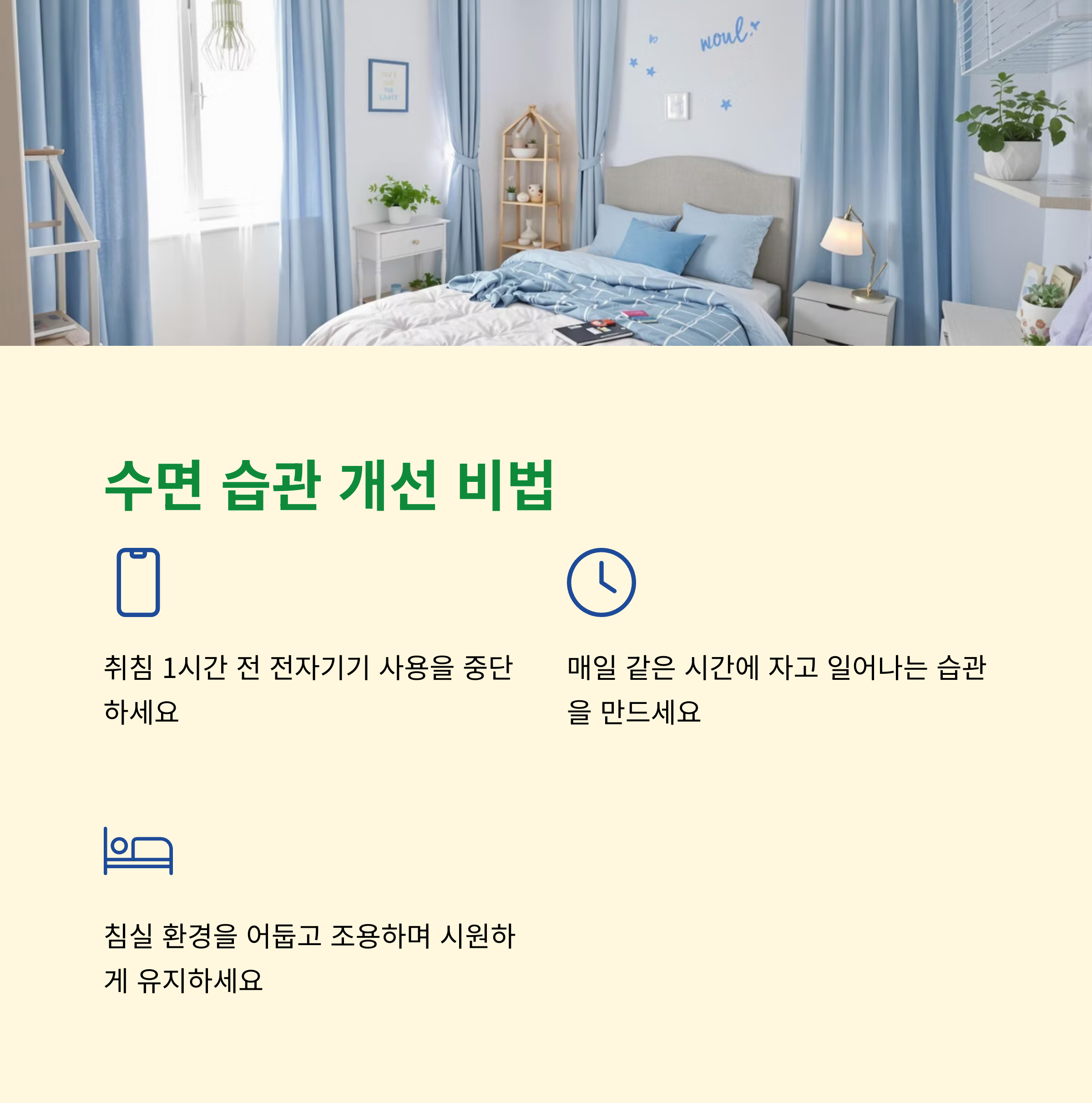 수면은 단순한 휴식이 아니라 건강을 유지하는 필수 요소입니다. 오늘부터라도 꾸준한 수면 습관을 기르고 충분한 휴식을 취해 보세요! 건강한 수면 습관이 삶의 질을 향상시킵니다.