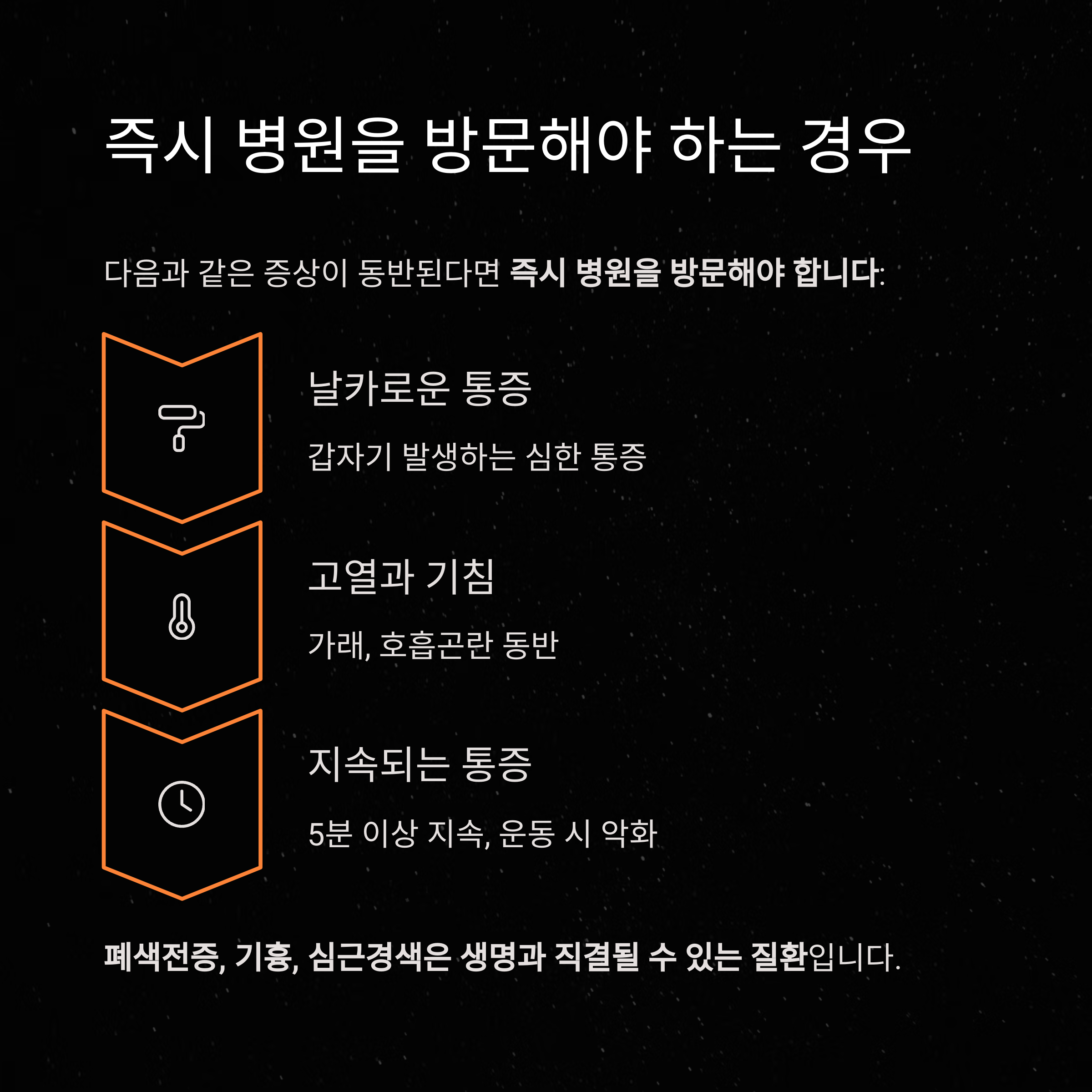 호흡 시 통증이 악화된다면 폐 질환 가능성이 크므로 반드시 진료가 필요합니다